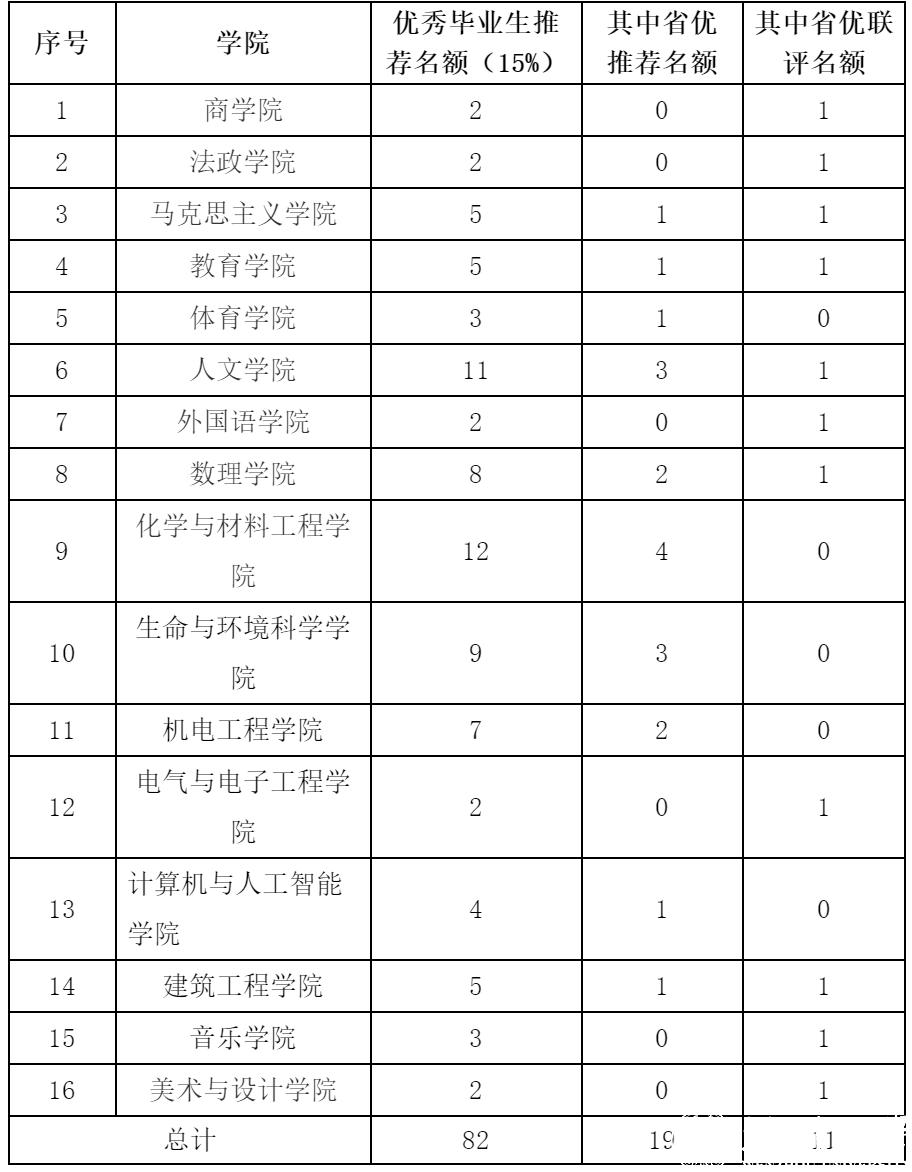 根据毕业生就业系统名单测算,拟评选27名研究生省优毕业生,其中19个指标以“推荐名额”按比例直接分配到学院,8个指标在11个学院的推荐人选中通过联评产生(经联评未被推荐为省优毕业生的3人为校优毕业生)。拟评选校优秀毕业生55人,具体指标分配见下表。