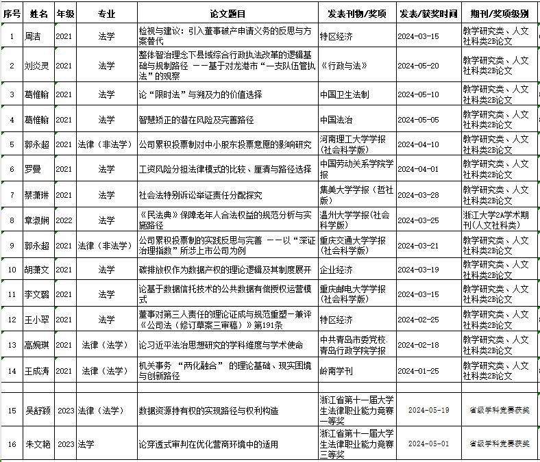 根据《看片狂人 研究生科研奖励办法(2017年修订)》《看片狂人 大学生学科竞赛管理办法(2020)》及学校关于2024年上半年研究生科研奖励申请的通知,经学生通过研究生管理系统提交申请、学院审核,现将申请结果公示如下。公示结束后,提交至学校研工部审核,学校根据相关“奖励办法”给予奖励。