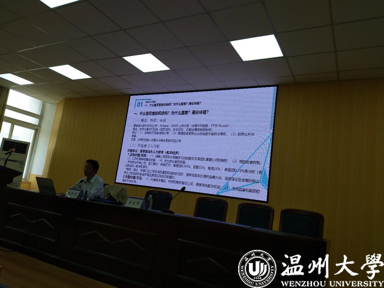 讲座主要分为五个部分:第一部分是分析双重股权结构的基本问题,涉及该制度的概念、特点、本质、价值意义与功能、理论依据等。赵金龙教授认为双重股权结构的本质是决策权的控制,不同的表决权安排为股东提供了更多的选择方案,但该股权架构存在正向价值和负面价值,赵教授还从委托代理理论、控制权理论、管家理论、企业生命周期理论等方面阐释了双重股权结构制度的基础理论。第二部分是双重股权结构及制度产生与发展,涉及该制度产生与发展动因、历史沿革与趋势。赵教授在剖析出现双重股权制度的内外因的基础上,梳理了美、日、德、英等国和我国香港地区的制度构建状况,并就我国目前的法律法规和政策情况进行了归纳。第三部分是双重股权架构的基本架构,涉及特别表决权股表决权数量、适用事项、股权转化、股权转让与继承等。第四部分是双重股权结构制度的适用条件,涉及适用主体范围、持有人主体资格及发行时间与条件等。第五部分是双重股权结构制度实施的法律保障措施,涉及控股股东的信义义务、强化公司内部制衡机制、严格的信息披露制度、证券集团诉讼制度、公司自我约束性承诺等。