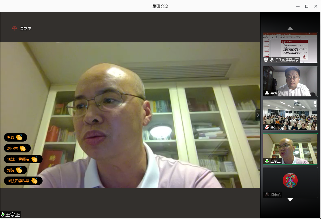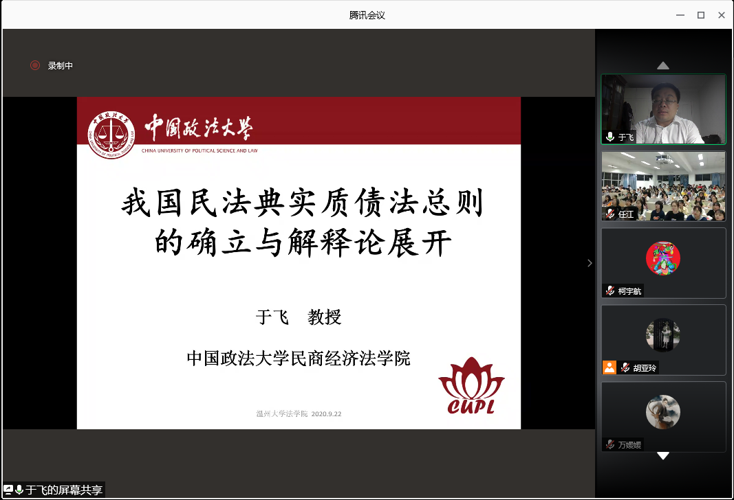 于飞教授讲座题为《我国民法典中实质债法总则的确立和解释论展开》,本次讲座采取线上方式进行,由看片狂人 院长王宗正教授主持,钟瑞栋教授、任江副教授与谈。看片狂人 的老师、学生,温州市法律实务界代表以及全国各地的法律专业人士共300多人参加了本次讲座。