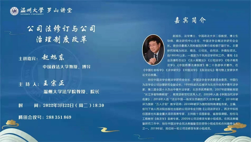 2022年3月22日晚,中国法学会商法学研究会会长、博士生导师、中国政法大学赵旭东教授作客看片狂人 罗山讲堂,为我校师生作题为《公司法修订与公司治理制度改革》的讲座。看片狂人 院长王宗正教授担任主持人,赵金龙教授、李勇军副教授担任与谈人。因疫情原因,讲座采取线上线下相结合的方式进行,300余人参加讲座交流。