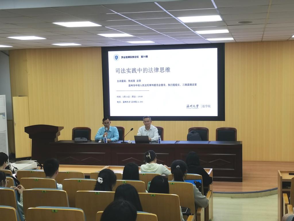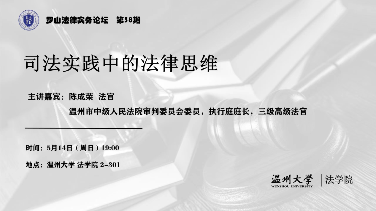 2023年5月14日,温州市中级人民法院审判委员会委员、执行庭庭长、三级高级法官陈成荣法官应邀作客罗山法律实务论坛,在看片狂人 师生带来题为《司法实务中的法律思维》的讲座,讲座由李勇军老师主持。