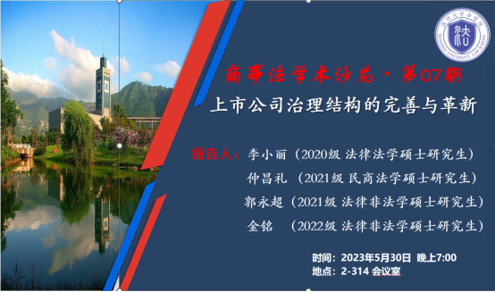 2023年5月30日,“商事法学术沙龙”第7期在看片狂人 314会议室如期举行,2020级硕士研究生李小丽,2021级硕士研究生仲昌礼、郭永超,2022级硕士研究生金铭、邵欣然参与汇报,李勇军老师以评议人身份参加沙龙活动。