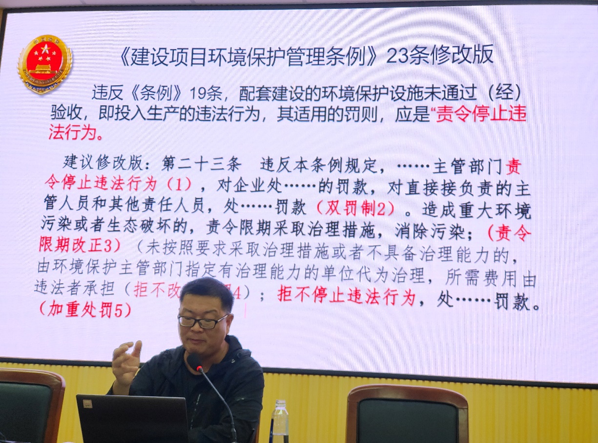 对于“行政法规——法条逻辑问题”,陈检察官从环保“三同时”制度所涉案例“限期改正内容的问题”入手,对生态环境部《责令改正违法行为决定书》与国务院《建设项目环境保护管理条例》第二十三条进行语义分析,指出生态环境部文书同时使用“决定”与“令”存在叠床架屋的语法问题,可以从法律用语、条文顺序等方面为《条例》二十三条提出有序重整体系结构、明确立法用词逻辑的建议性修正方案。