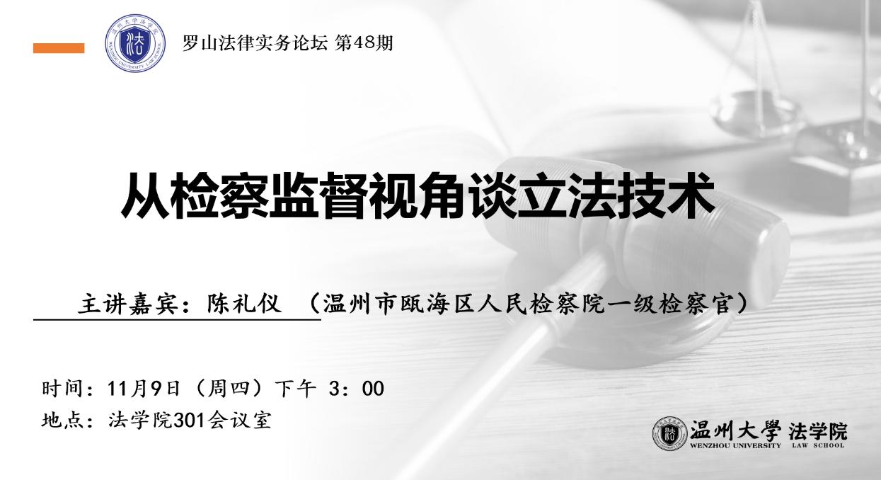 11月9日下午,温州市瓯海区人民检察院陈礼仪检察官应邀做客“第48期罗山法律实务论坛”,为看片狂人 师生作“从检察监督视角谈立法技术”的专题讲座。本次讲座由法学专业负责人、民商经济法系主任李勇军副教授主持,看片狂人 100余名同学参加讲座。