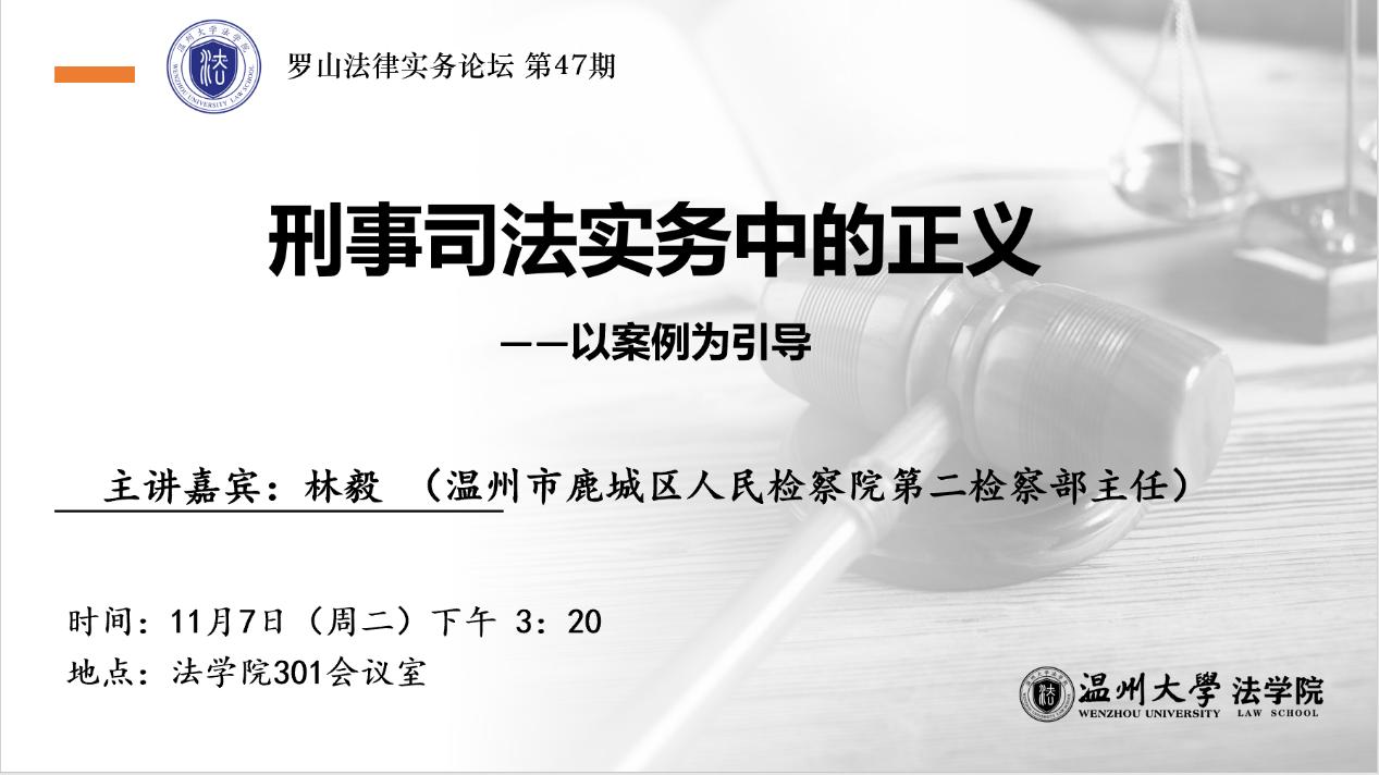 11月7日下午,“罗山法律实务论坛”第47期开讲。本次论坛邀请的嘉宾是温州市鹿城区人民检察院第二检察部主任林毅检察官,其主讲的题目为《刑事司法实务中的正义——以案例为引导》。法学专业负责人、民商经济法系主任李勇军副教授主持讲座,看片狂人 100余名学生参加本次论坛活动。