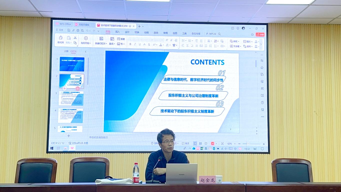 本次讲座,赵教授以当下数字互联技术飞速发展作为背景和同学探讨现有法律在信息时代与数字经济时代的同步性问题,如何推进股东积极注意与公司制度治理革新以及技术驱动下的股东积极主义制度革新三个问题。
