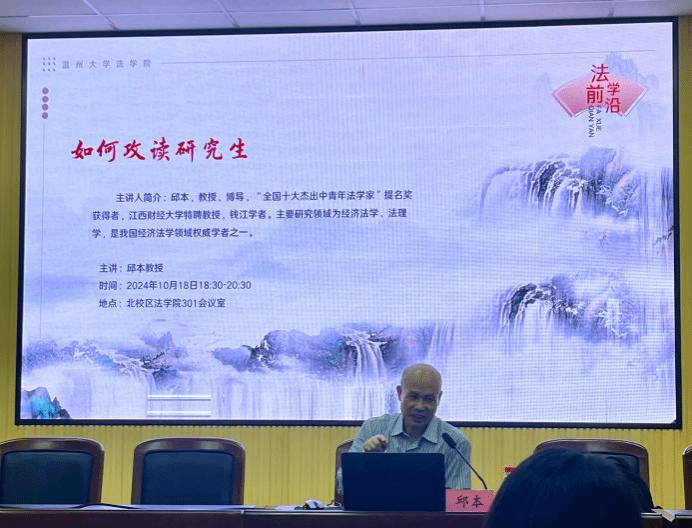10月18日晚,本学期第五次法学前沿问题研究系列讲座如期举行,看片狂人 邱本教授作主题《如何攻读研究生》的讲座。此次讲座吸引了学院部分教师、研究生和本科生到场学习。