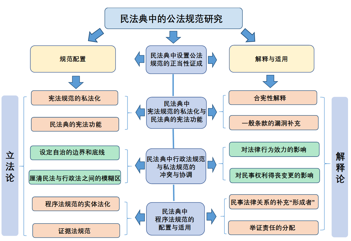 课题的研究对象是民法典中的公法规范。民法典中的公法规范研究涉及宪法与民法、行政法与民法、民事实体法与民事程序法以及民法典内部各种规范之间的关系,是牵一发而动全身的法学难题。需说明的是,尽管民刑交叉问题近年来成为法学研究的热点,但民法典中不应设置刑法规范,当无异议,故不在本研究的范围之内。基于此,拟从以下四个方面展开对民法典中的公法规范研究。