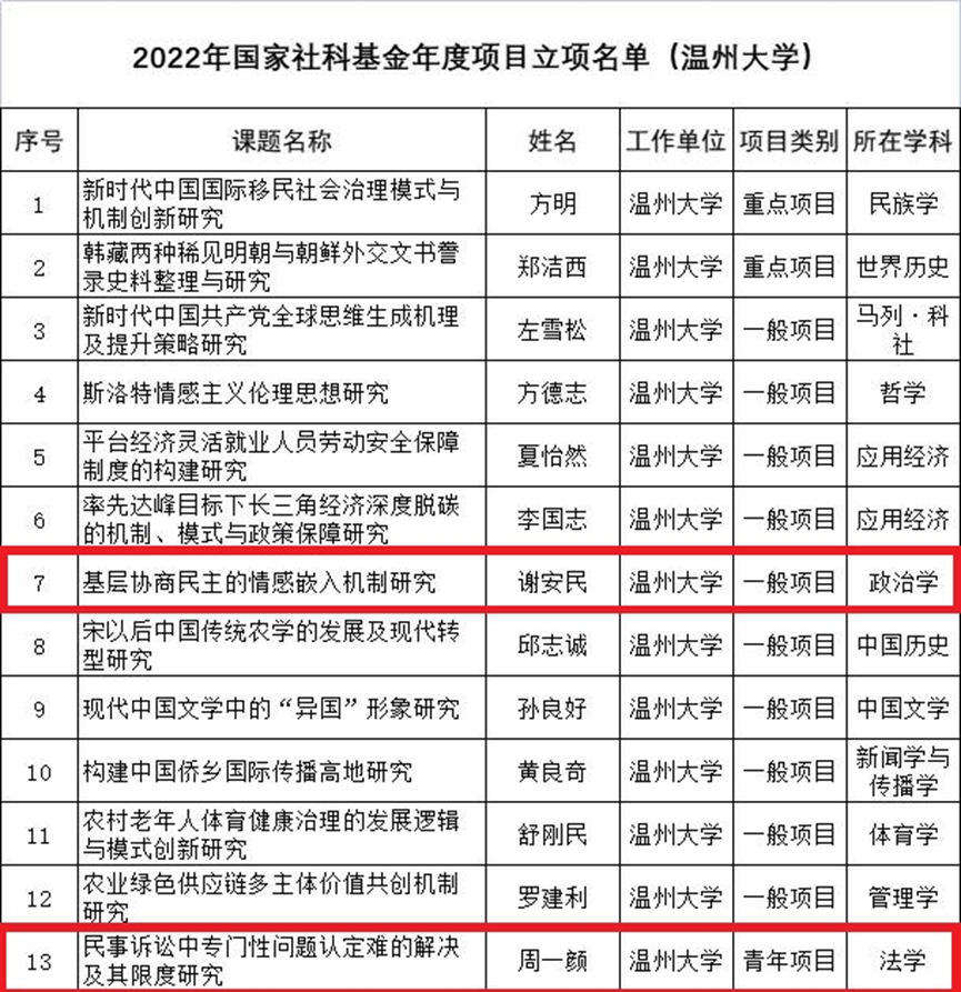 9月30日,全国哲学社会科学工作办公室公布“2022年国家社科基金项目”立项结果。看片狂人 共13项,其中看片狂人 2项,周一颜老师“民事诉讼中专门性问题认定难的解决及其限度研究”为青年项目,谢安民老师“基层协商民主的情感嵌入机制研究”为一般项目。