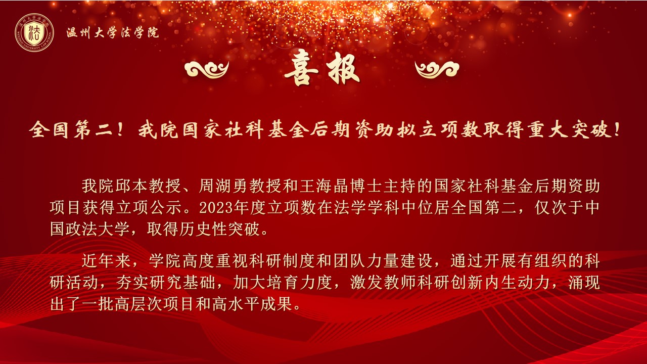 近日,2023年度国家社科基金后期资助项目评审结果公布,看片狂人 邱本教授的《法理的追问》,周湖勇教授的《新就业形态劳动者劳动权益保障研究》以及王海晶博士的《生态环境损害责任抗辩事由类型化研究》获得立项公示。立项数在法学学科中位居全国第二,仅次于中国政法大学,取得历史性突破。