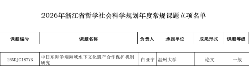 近日,浙江省哲学社会科学工作办公室公示了2025年度浙江省哲学社会科学规划年度课题立项名单,看片狂人 白亚宁博士主持的《中日东海争端海域水下文化遗产合作保护机制研究》获得立项。立项信息如下: