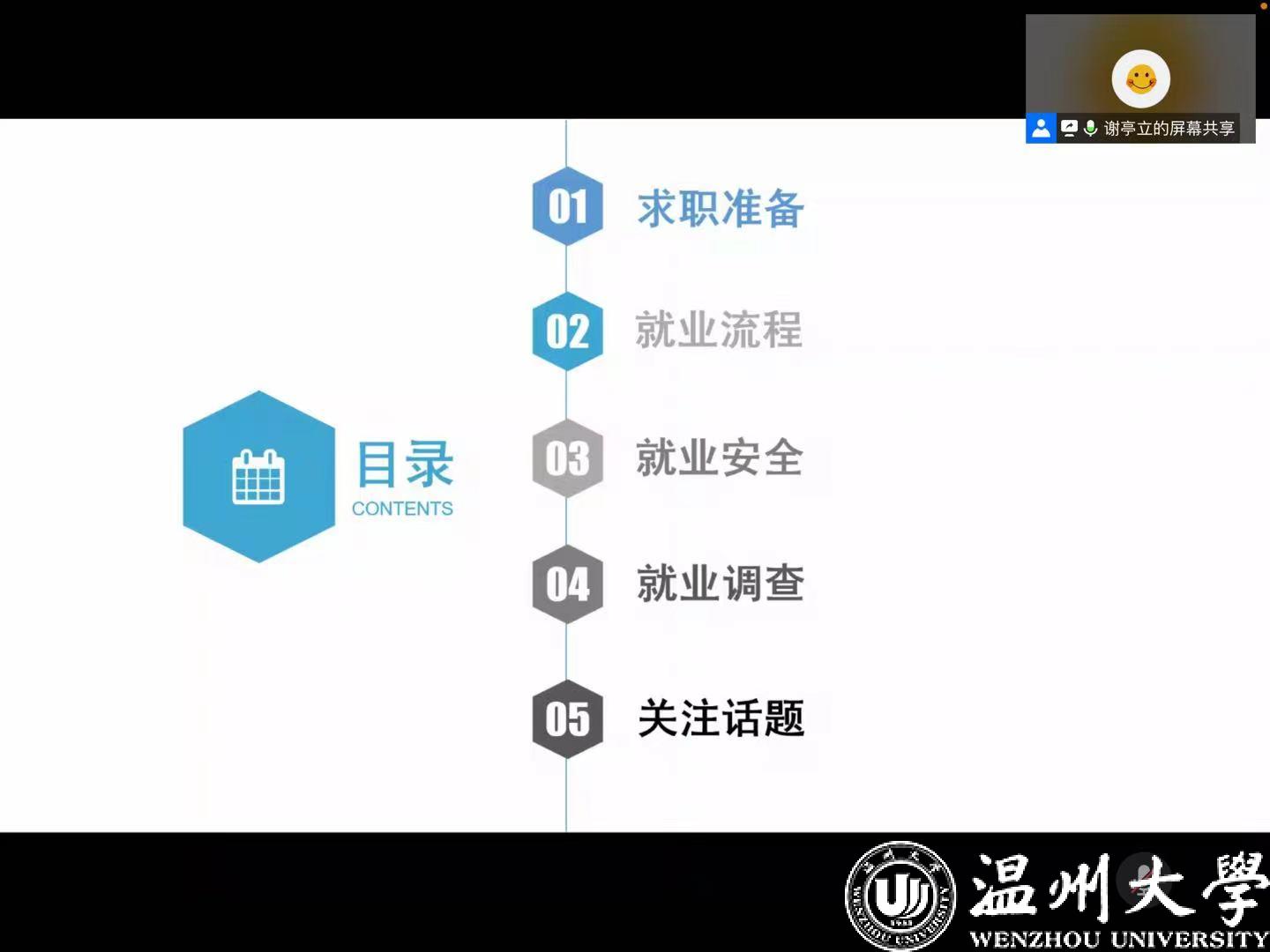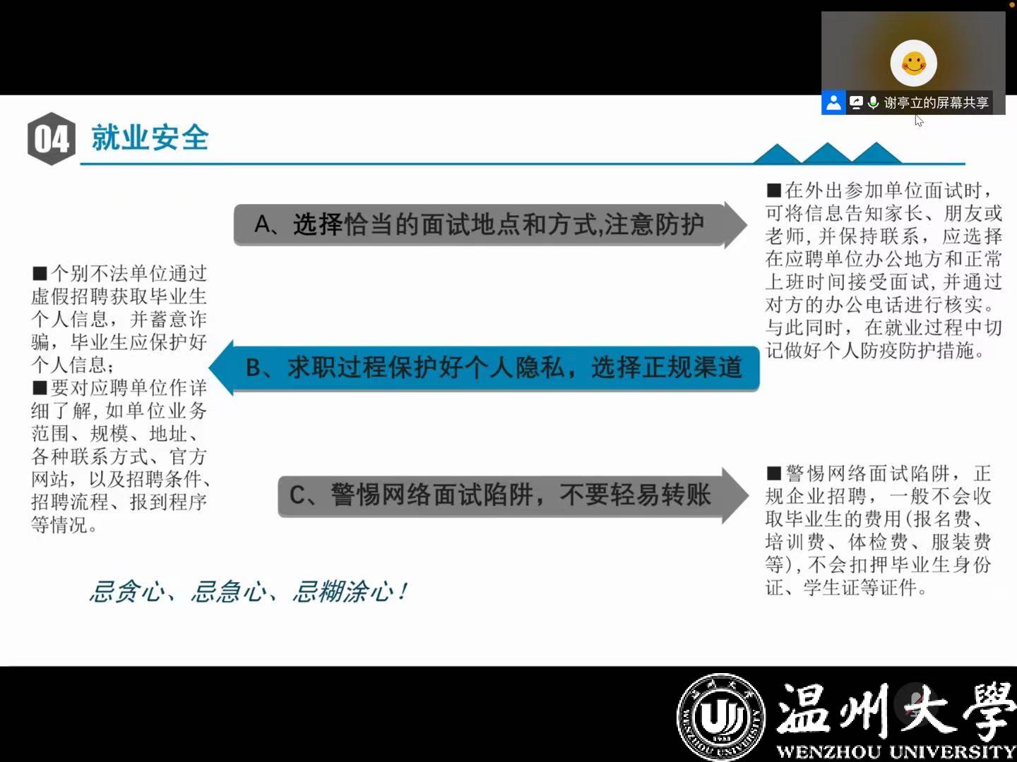 首先,朱秀微老师对2021届毕业生就业政策进行解读。她引入具体案例,分析了当前就业形势,提出疫情影响不确定性、“高期望”和“慢就业”加剧、新领域新业态从业人数增多等情况。她讲解了国家相关就业创业政策,建议毕业生们利用好国家相关就业网了解就业信息。她结合温州市510政策,鼓励更多毕业生学在温州,就业在温州。