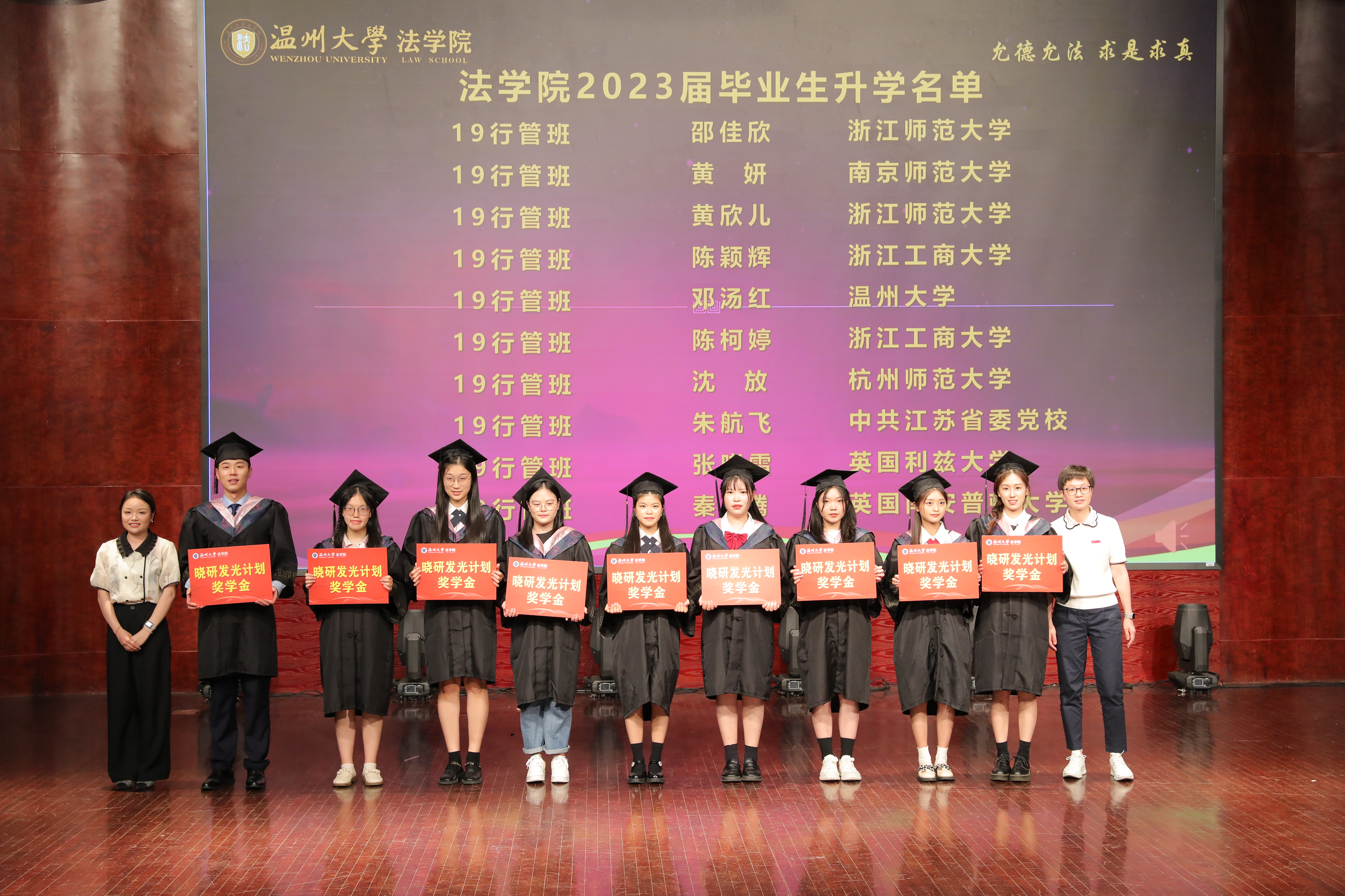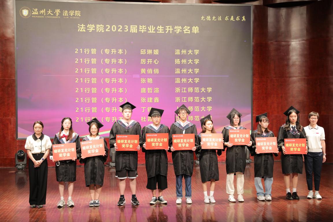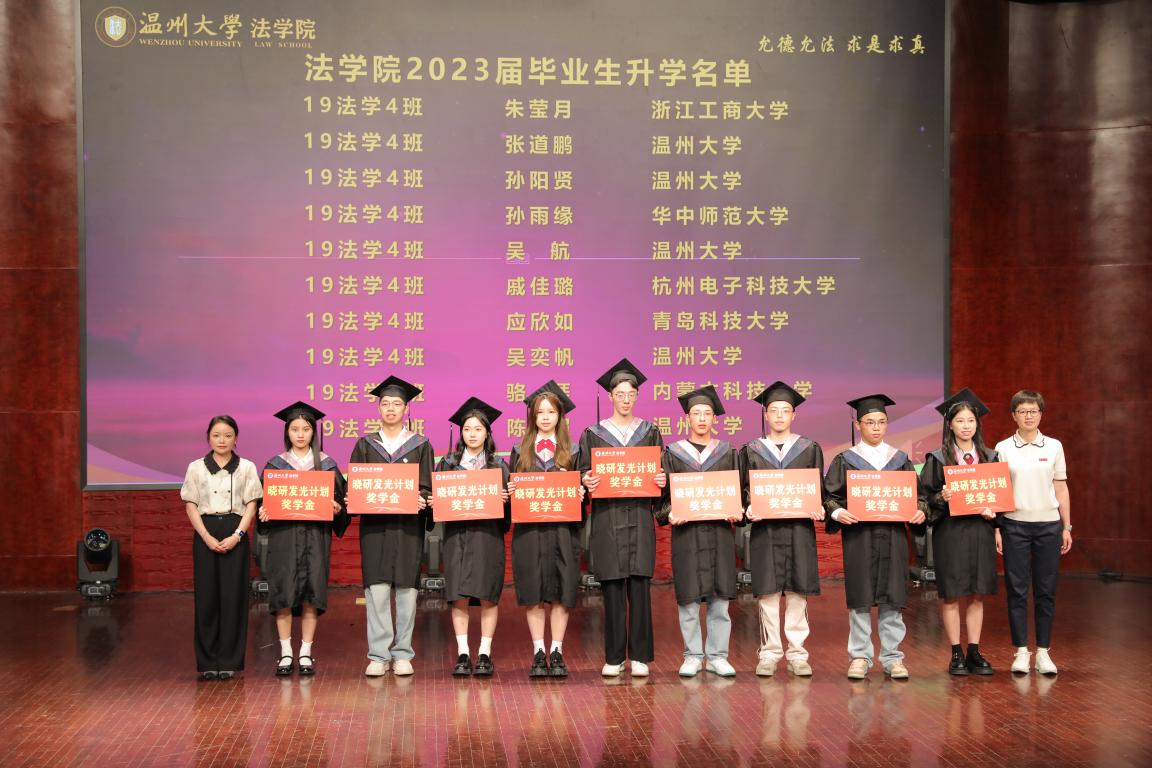 在考博考研的征途中,看片狂人 2023届共53名学生成功考取心仪院校。近日,学院成立了晓研升学专项奖学金,由优秀校友、温州市晓研教育信息咨询有限公司陈华娟校友热心出资设立,专项用于学生升学奖励。典礼现场,院长王宗正、党委书记林钦、副院长周一颜、优秀校友陈华娟为同学们颁发升学奖学金并送上诚挚的祝福。