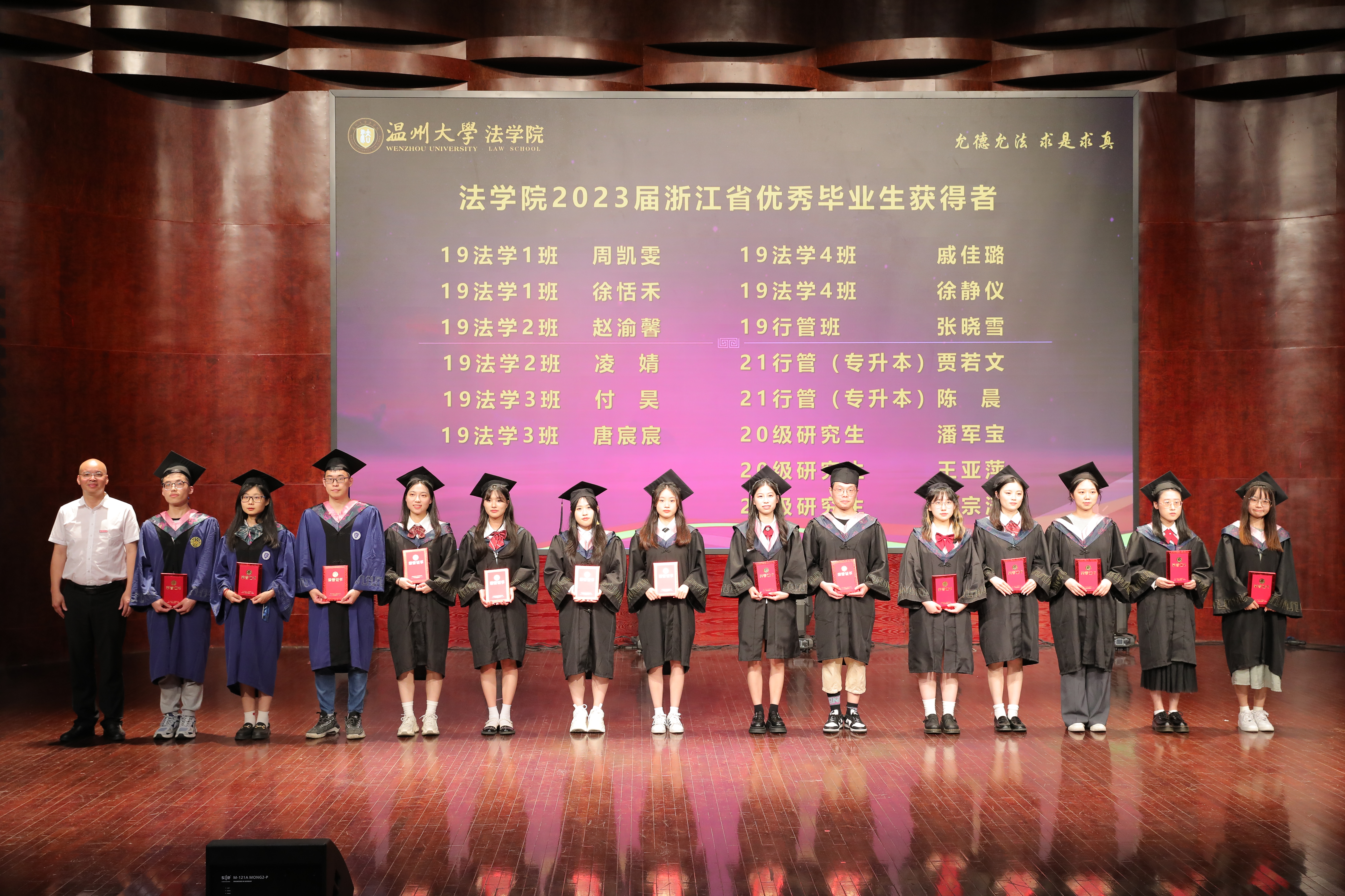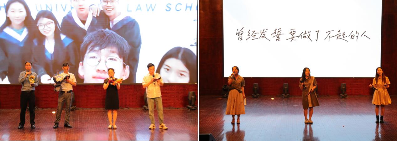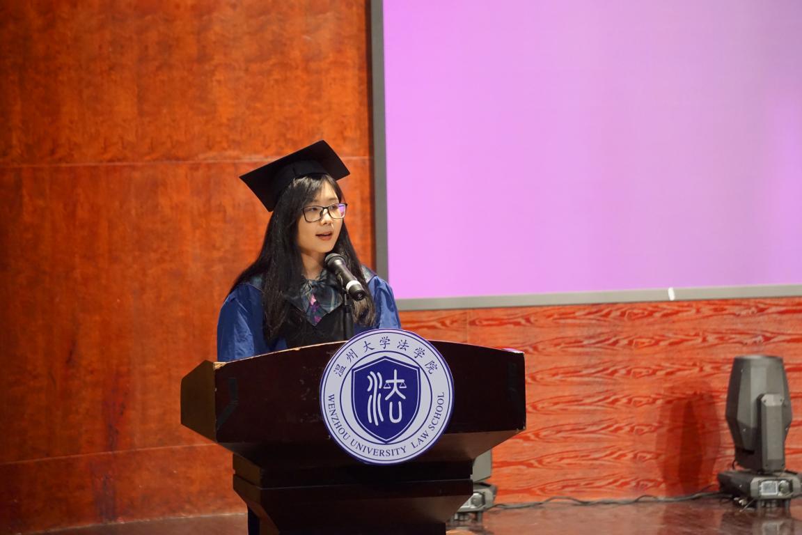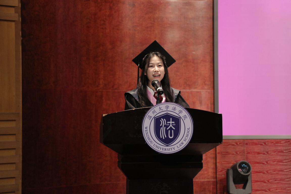“那时的我们心怀对法律的敬畏、对正义的执着、对法学的热爱,从五湖四海而来,而如今,离别的钟声却已敲响。”国家奖学金获得者、浙江省优秀毕业生王亚萍作为研究生毕业生代表发言,她分享了自己三载春秋寒暑的感悟,祝福所有毕业生他日凌云,万事胜意。所有的经历都将成为我们宝贵的财富。“就让我们兴致盎然的与世界交手,满怀期待的对未来作出判决,跃入人海,光明灿烂。”