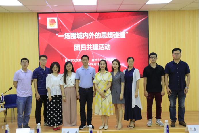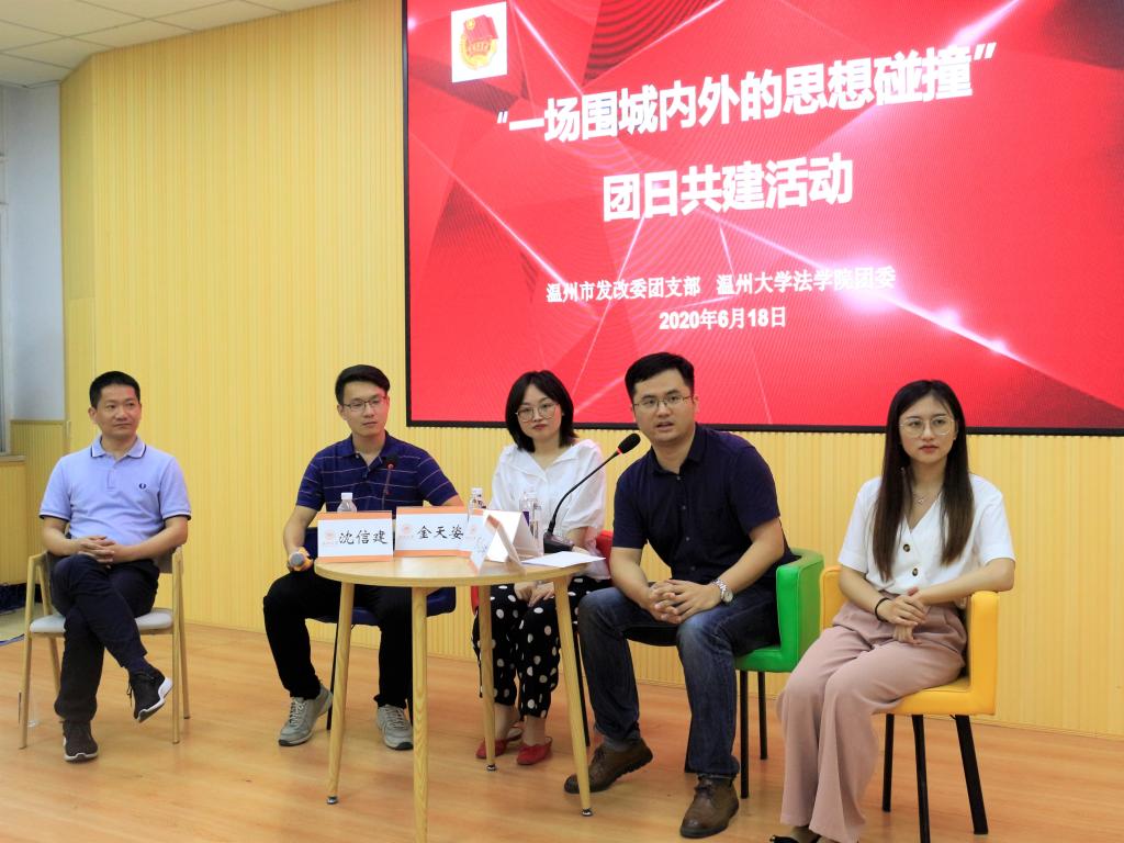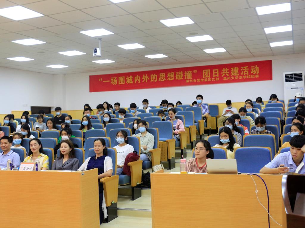 6月18日晚,看片狂人 团委与温州市发改委团支部联合举办的“一场围城内外的思想碰撞——关于机关就业的话题”团日共建活动在法学楼301举行。本次讲座由市发改委团支部书记张嘉倩和看片狂人 学工班主任林丽丽主持,金天姿、沈信建、虞臣肖和王琼四位发改青年干部主讲,市发改委团支部委员王俊组织工作,并特邀市发改委人事处(机关党委)处长汪振标、看片狂人 学工部副部长吕乐参加本次活动。