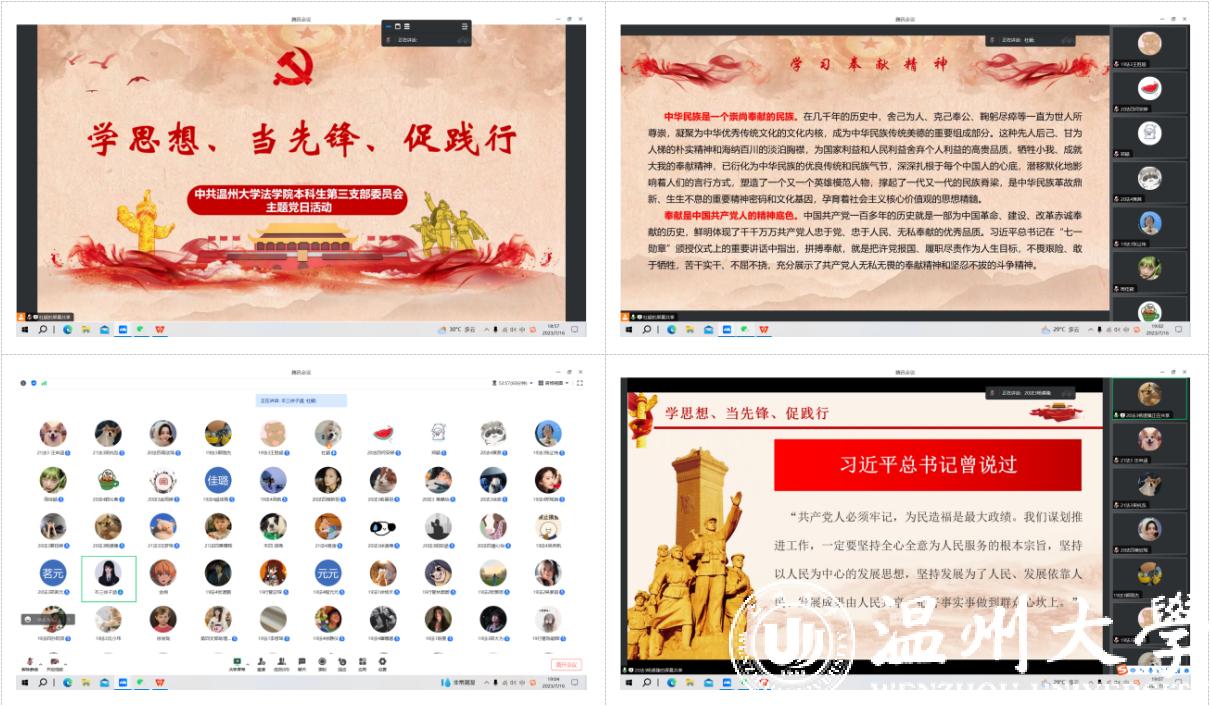 党的二十大报告指出,“统筹推动文明培育、文明实践、文明创建,推进城乡精神文明建设融合发展,在全社会弘扬劳动精神、奋斗精神、奉献精神、创造精神、勤俭节约精神,培育时代新风新貌”。为深入学习贯彻习近平新时代中国特色社会主义思想和党的二十大精神,进一步发挥基层党组织的战斗堡垒作用和共产党员的先锋模范作用,7月16日晚,中共看片狂人 本科生第三支部委员会在线上开展了“学思想、当先锋、促践行”主题党日活动,本次活动由杜颖同志主持,参加本次活动的有党支部书记黄素素同志和全体学生党员。