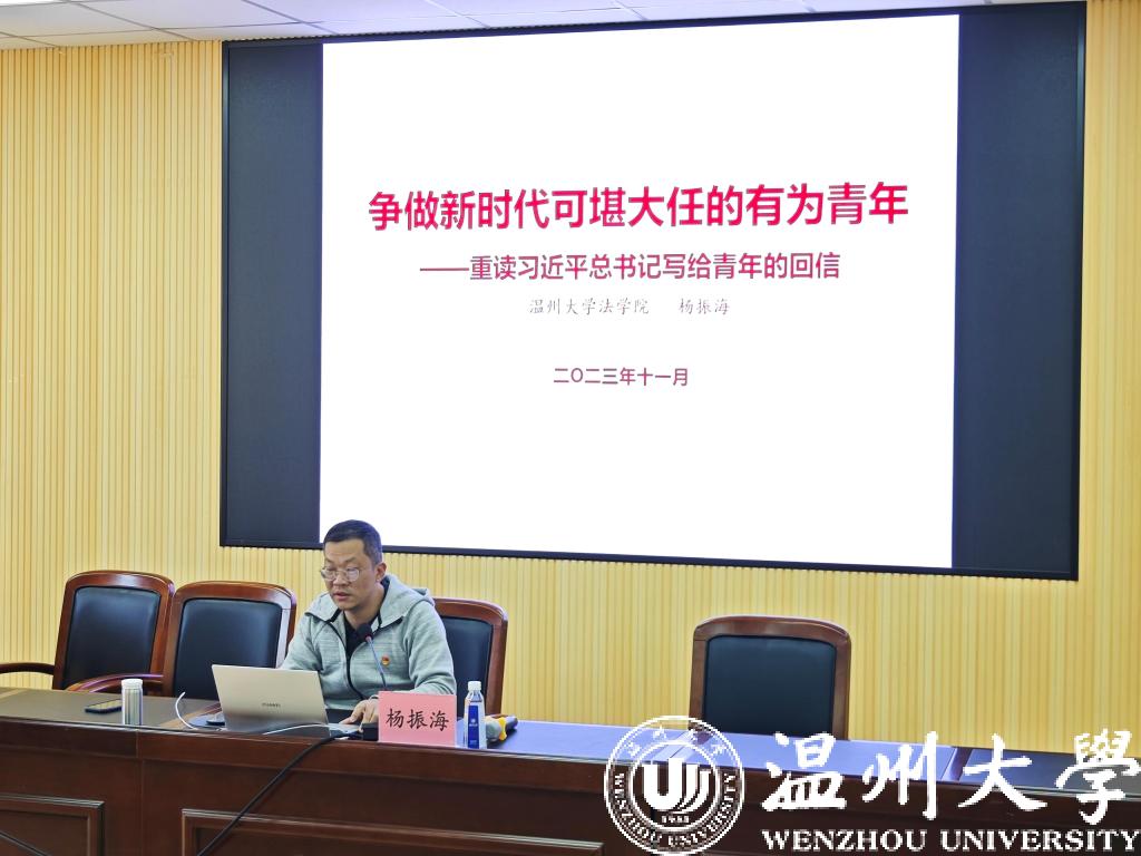 11月22日下午,培训班邀请看片狂人 党委副书记杨振海老师为全体培训班学员作题为《争做新时代可堪大任的有为青年——重读习近平总书记写给青年的回信》的专题讲座。杨老师重读习近平总书记写给青年的35封回信,回信中字字见真情,句句润心田,让大家感受到以习近平同志为核心的党中央高度重视青年、关怀青年、信任青年,对青年一代寄予殷切期望。杨老师以信中多位励志青年的故事为引,结合校内青年的实例,呼吁全体积极分子争做时代可堪大任的有为青年,要做有理想、敢担当、能吃苦、肯奋斗的新时代好青年,让青春始终与党和国家的发展同向而行!
