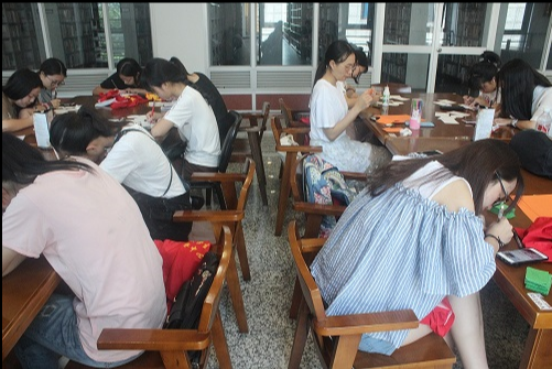 上午九点,队员们陆陆续续到了图书馆二楼。在队长和副队的带领下,19个人被分成了三组,第一组负责制作爱心祝福卡片,第二组负责制作抽奖卡,第三组负责制作记分卡。任务分配之后,每个组都开始有条不紊地工作起来。爱心卡片组通过制作爱心卡片送给老人,附上点点温馨的祝福:"满目青山夕照明,愿您晚年幸福,健康长寿"、"事事顺心,幸福常伴;寿比天高,福比海深;日月同辉,春秋不老"······朴实的话语中饱含着队员们对老人的衷心祝愿。一双双灵巧的双手,描绘着一份份真挚的感情,看着一张张精美的爱心祝福卡片的诞生,深切感受到队员们对老人的关怀。人多力量大,在所有队员的共同努力下,100张爱心卡片、100张游园记分卡和75张抽奖卡片如期完成。