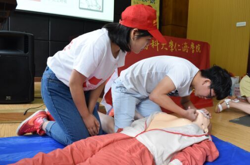 图 5在温医同学的帮助下,队员们进行了心肺复苏救护练习