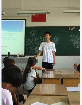 上午八点,上课铃声响起。实践队成员汪瑜婷和单栋楹开始为1班的小学生们上美术课。这节课主要教小朋友们线描。首先为大家介绍了线描的基本知识,并在PPT上展示了一些作品以及各种线条和点的画法和组合。为了让小朋友们能更好地掌握,两位小老师还在黑板上进行示范。接着就是小朋友们的自由发挥时间,绘画的主题是手。他们利用简简单单的一支水笔和一张白纸,充分发挥想象力,天马行空,最后呈现的作品虽然有些稚嫩,但富有童趣和创意。2班则是郑荣权的趣味故事课。在正式开始讲故事前,他先让小朋友们玩了一个报数的游戏。在输的小朋友上台接受惩罚时,一个小姑娘表演的用口哨吹《虫儿飞》很让我们惊喜。简单的小游戏过后,课堂气氛活跃起来。郑荣权为小朋友们带来的是《伊索寓言》。生动的讲述和故事本身的魅力让孩子们沉浸其中,并时不时提问。故事结束后,是一个小讨论。在老师的引导下,大家积极发言,说出自己对故事的感想。