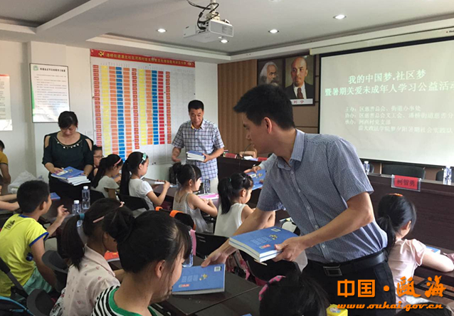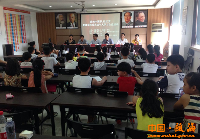 为丰富青少年暑期生活,让孩子们暑假中不仅只有学习,还有愉快的精神文化生活,过一个不一样的暑假,区下派指导员吴海萍主动沟通联系区慈善总会及义工分会,联合潘桥街道、温大政看片狂人 梦夕阳暑期社会实践队,在横仙河社区河西村民中心开展"我的中国梦.社区梦"暨暑期关爱未成年人学习公益活动。