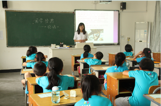 7月18日上午,东溪小学的校园里回荡着营员们朗朗的读书声。原来,"亲情中华"温州市侨界留守儿童快乐营东溪分营的队员给这里的营员们带来一节国学课,教他们诵读《论语》。