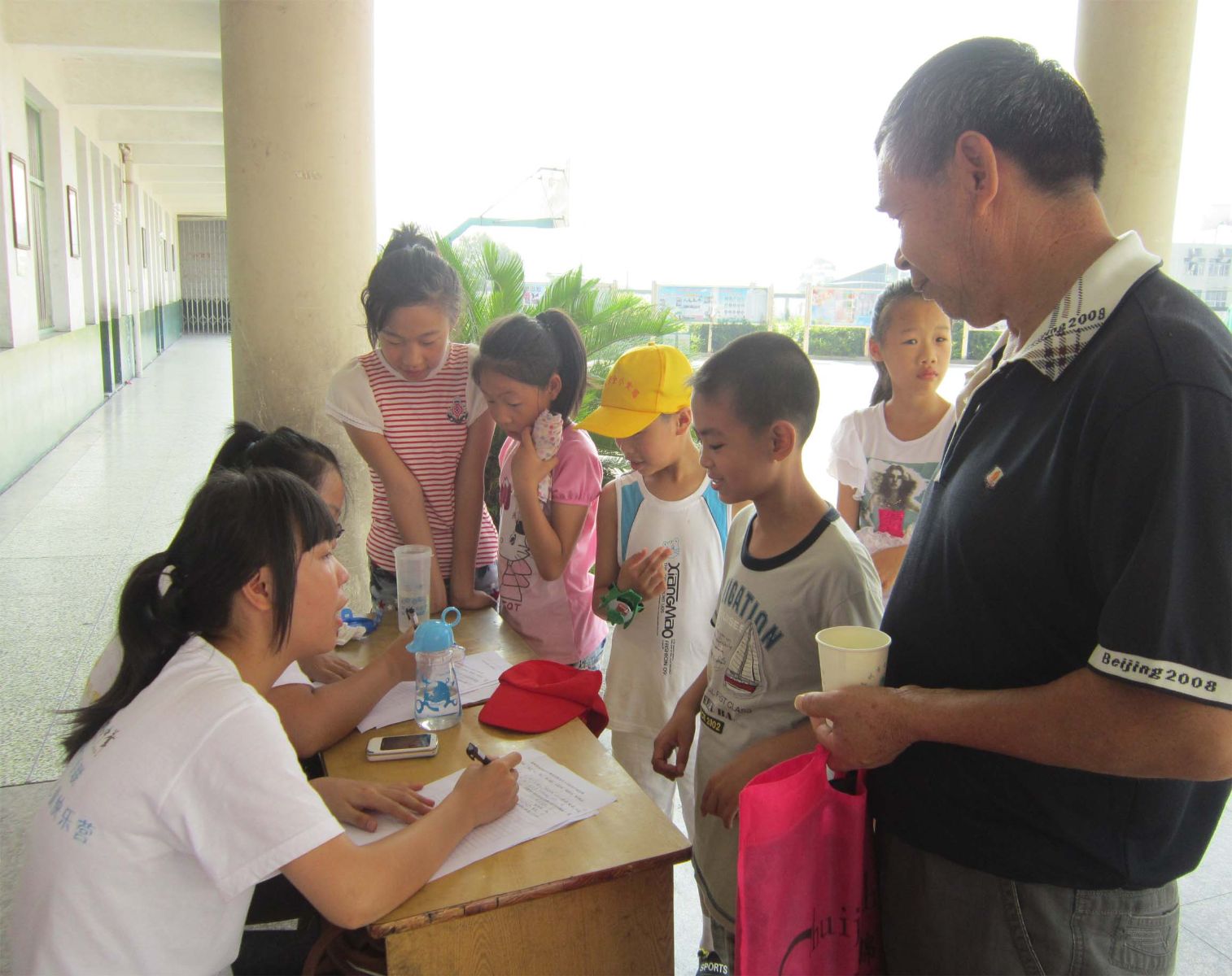 今天上午,报名参加此次快乐营活动的留守儿童们,在8点以后陆陆续续赶来永嘉县乌牛镇中心小学。队员们开始了一天忙碌又充实的工作。由于队员多是外地人,不会使用温州话进行交流,接待员与接待家长的工作重担便交付在了两名温州籍队员身上。其他队员负责与到场的孩子们沟通交流,希望尽早了解孩子们的心理。