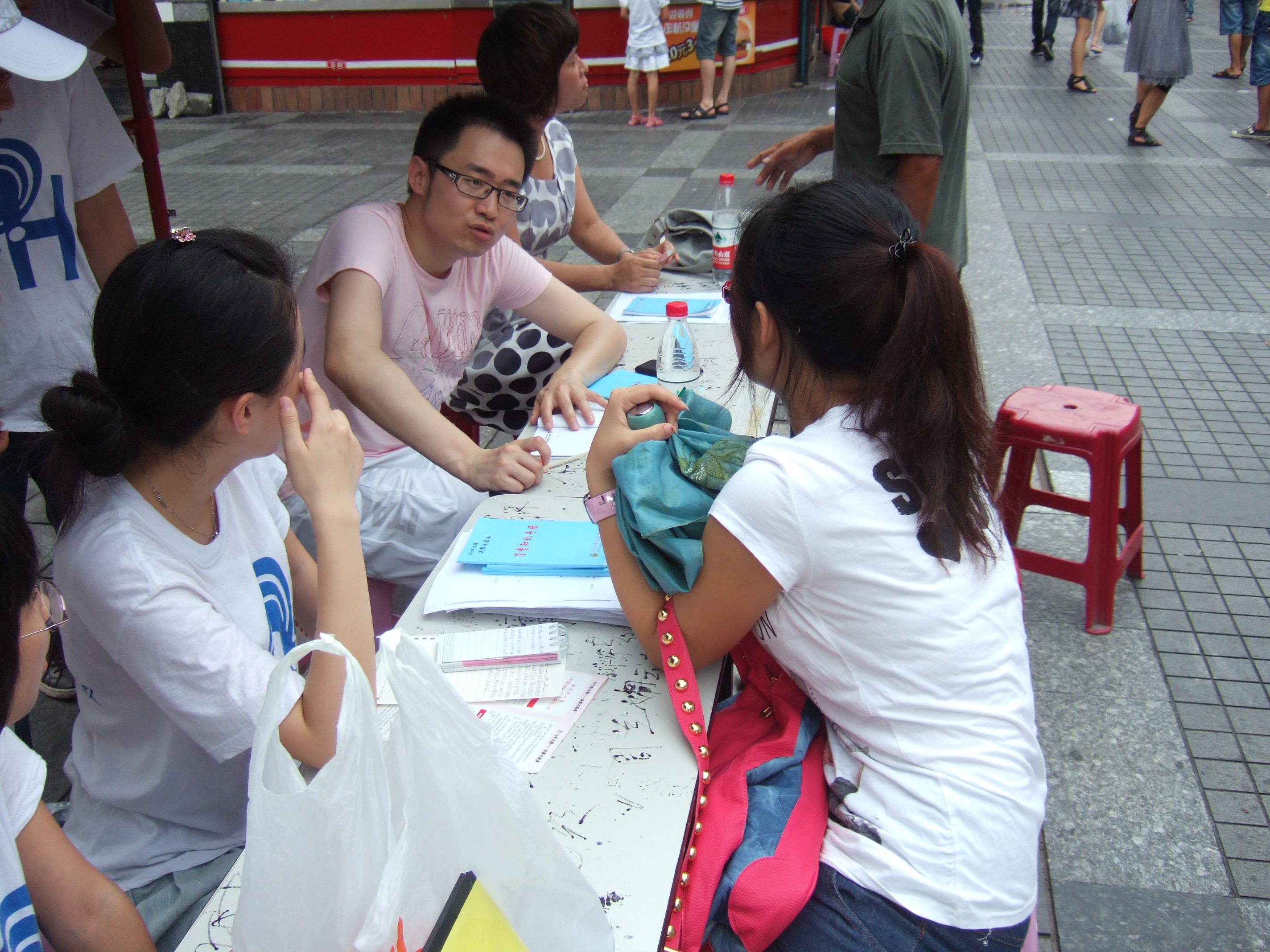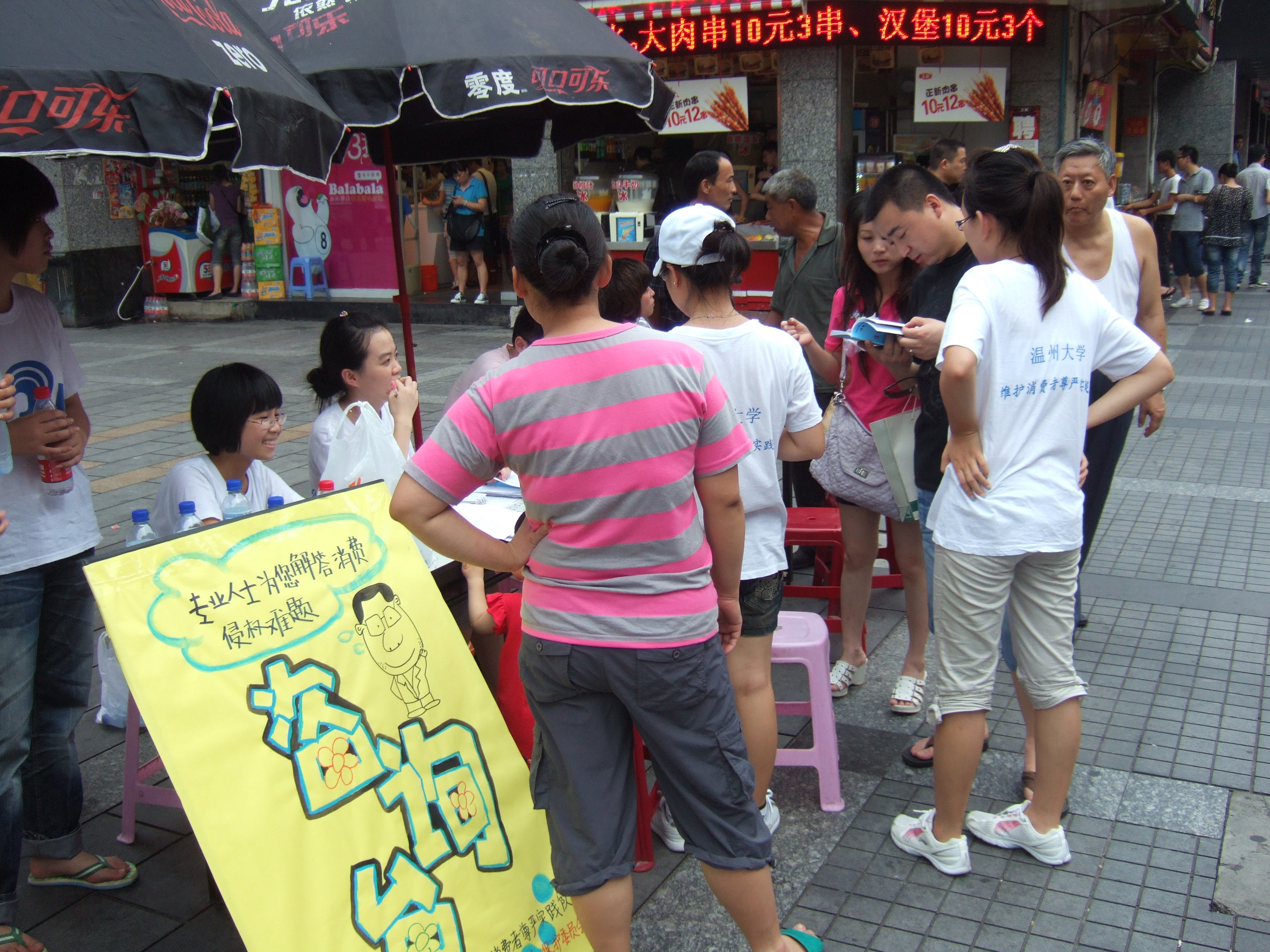 2010年7月10日星期六,看片狂人 法政学院"维护消费者尊严"暑期社会实践队在五马街设立了咨询台,为市民解答在消费维权过程中遇到的问题。温州市消费者权益保护委员会吴函老师、看片狂人 法政学院王新老师亲临现场进行指导,并帮助解决了市民提出的一些问题。