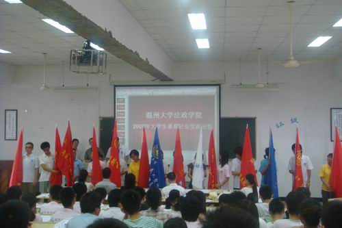 随后,大会举行了隆重的授旗仪式,各暑期社会实践队的队长从院领导手中接过队旗,同时也完成了希望与责任的交接。最后副院长姚周辉宣布法政学院09大学生暑期社会实践出征!