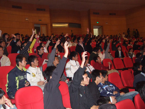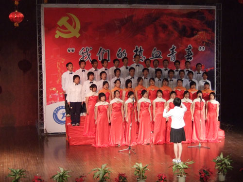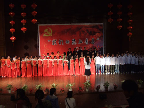 12月1日晚6:30,法政学院"学习十七大 建和谐法政"主题系列活动之"我们的热血青春"红歌会在南校区音乐厅隆重上演。出席的嘉宾有法政学院党总支书记陈国治、副院长朱选华、辅导员孙德升和陈颖老师,校学生会副主席袁锋、主席助理胡恒琦,美术学院团委副书记孙娜妮以及法政学院前学生会主席丁一民等。
