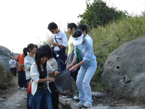 下午1时,同学们在C区门口整装待发,经过30分钟的车程,大家到达了此次活动的目的地——大罗山山脚下。按照事先的分组,同学们开始了登山的历程。原以为大罗山不高,可以轻松搞定,没想到,越爬越高,越爬越陡。特别是女生,爬了一段就体力不支都停下来休息了。但是同学们都没有放弃,男生更是主动在前面鼓励女生,有的还用一根树枝牵着女生想前走。经过了一个半小时的艰难跋涉,终于全体到达山顶。尽管历经艰辛,一路喊累,可是当看着一览无余的山下美景和身旁一个个气喘吁吁、大汗淋漓的同伴,同学们都会心的笑了。休息了一段时间,大家便按原路返回了。大家不顾路途的劳累,在下山途中还是积极地捡起了身边的垃圾,为美丽的大罗山更增添了几分靓丽。