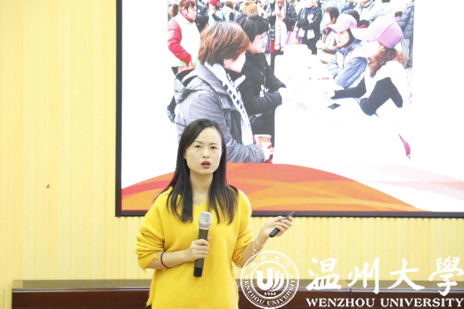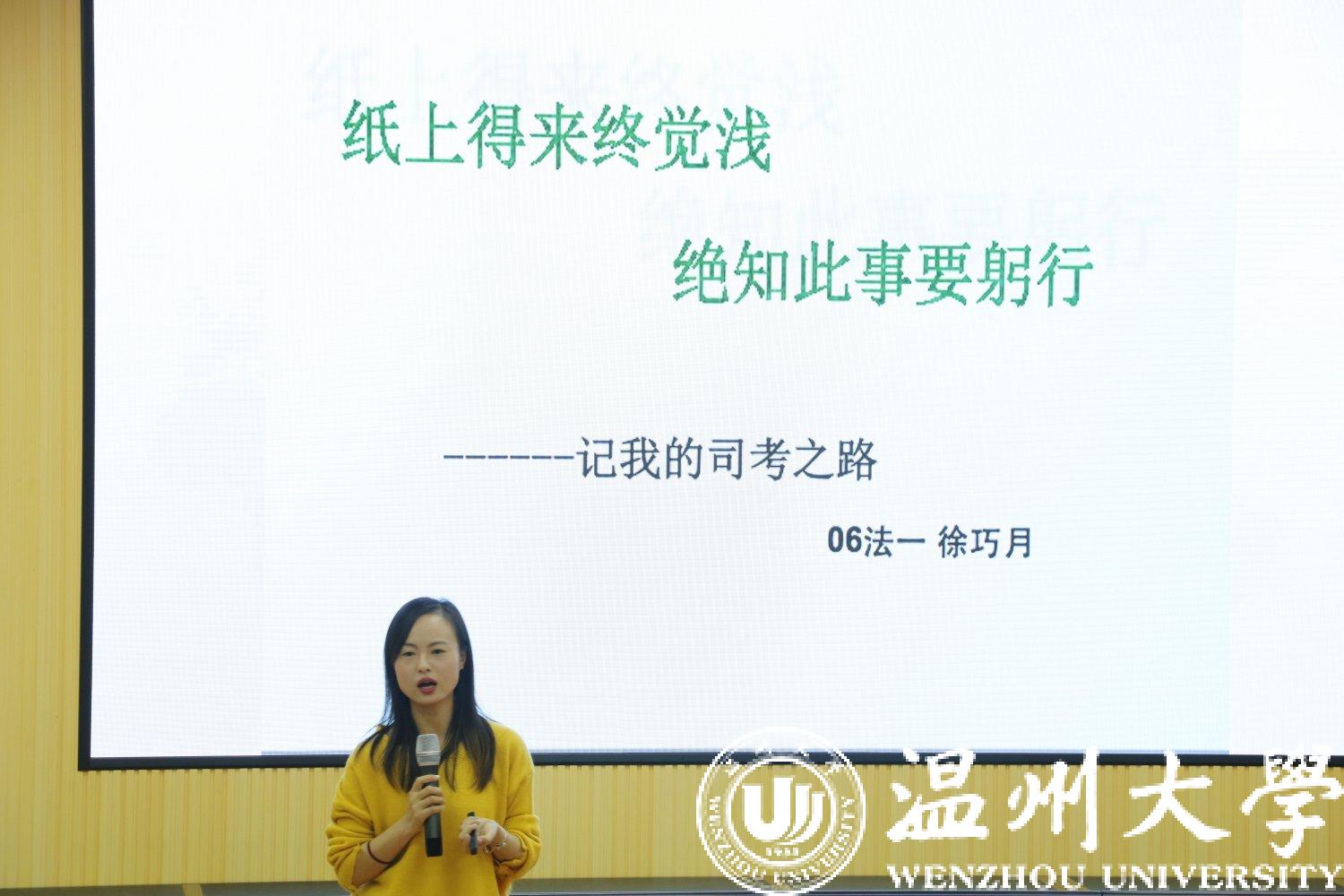 会上,徐巧月分享了大学四年学习生活和之后的工作经历,展示从温大看片狂人 启程的十年追梦之旅,表达了对母校的深深眷恋和感恩之情。她从社团工作、勤工俭学、校外兼职、专业比赛、扩展阅读、司法考试等方面以诙谐幽默的口吻与学弟学妹们进行了贴心分享。同时,徐巧月结合经历与体会,从学习和工作角度提出自己的理解和建议。她认为,在学习上有明确的计划和目标,要找准定位,在学好本专业的同时,适时地补充大量的课外知识,在工作上,要有认真负责的态度,协调好学习和工作的平衡,并提高效率。