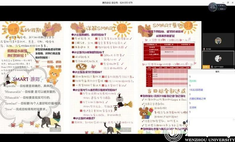 班长和学习委员针对网课期间的班级和学习情况进行了总结。班主任范兴科老师就停课不停学,端正新学期学习态度等方面为同学提出几点希望。他说道:“在抗击疫情的特殊时期召开本次特别的班会,很有意义,主要有两个目的,一是做好疫情防控知识宣讲,二是做好开学后同学们在家进行线上听课和学习的准备和安排。全体同学参加了线上班会,汇报了目前的生活和学习情况。希望同学们以积极向上的精神面貌和强健的体魄迎接返校日期的到来。”