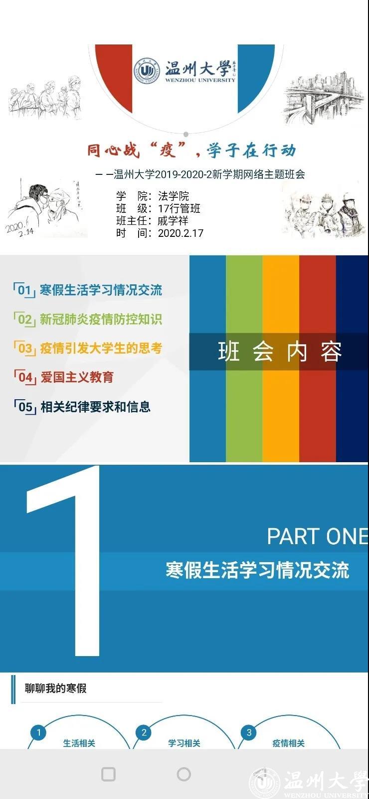 戚学祥老师首先了解了班级同学的健康情况,然后通过ppt分享向我们讲述了疫情进展情况以及疫情防控知识,并引发同学们分享疫情期间的学习生活感受。