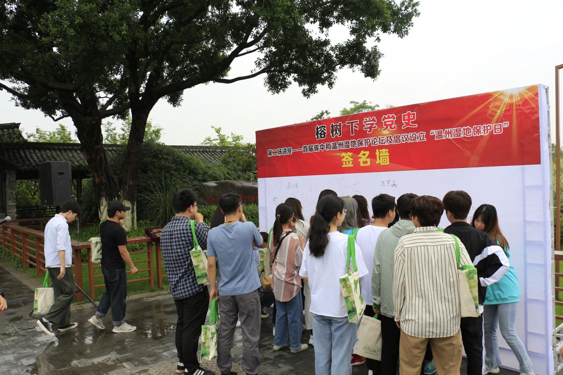 活动第二阶段,本次活动的全体代表来到习近平总书记18年前亲手栽种榕树下,聆听温州生态园管委会领导讲述“大榕树”的历史和习近平同志的生态文明思想。随后,环保志愿者代表发出倡议设立“温州市湿地保护日”。现场代表们在签名墙上认真地写下自己的名字,一笔一划中尽显大学生为环保事业做贡献的决心。