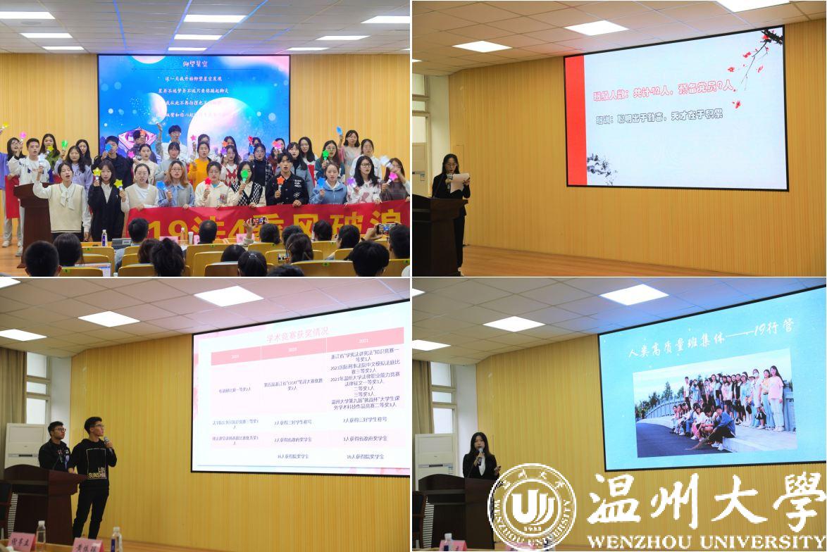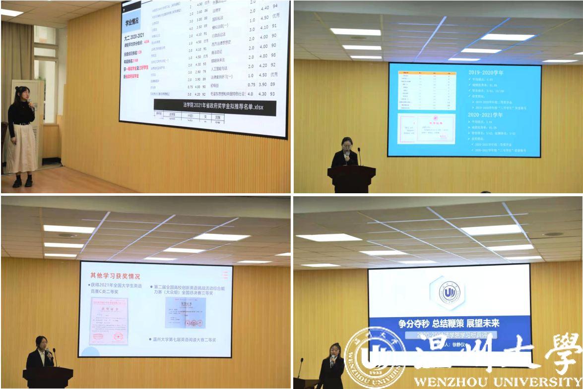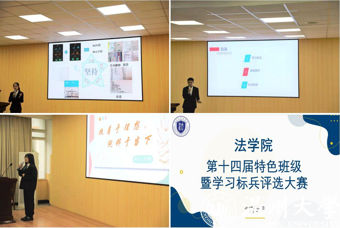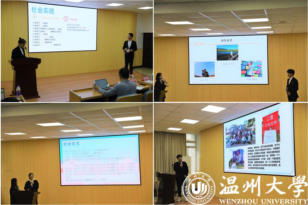 展示过程中,评委们分别从学习风气、素质拓展、纪律行为、展示水平等方面进行综合打分。最终,19法学4班拟推荐为校“优良学风班”,20法学1班、19行管班、20法学2班、19法学1班拟推荐为院“特色班级”,20行管班、20法学4班、19法学3班、20法学3班拟推荐为院“最具潜力班”。