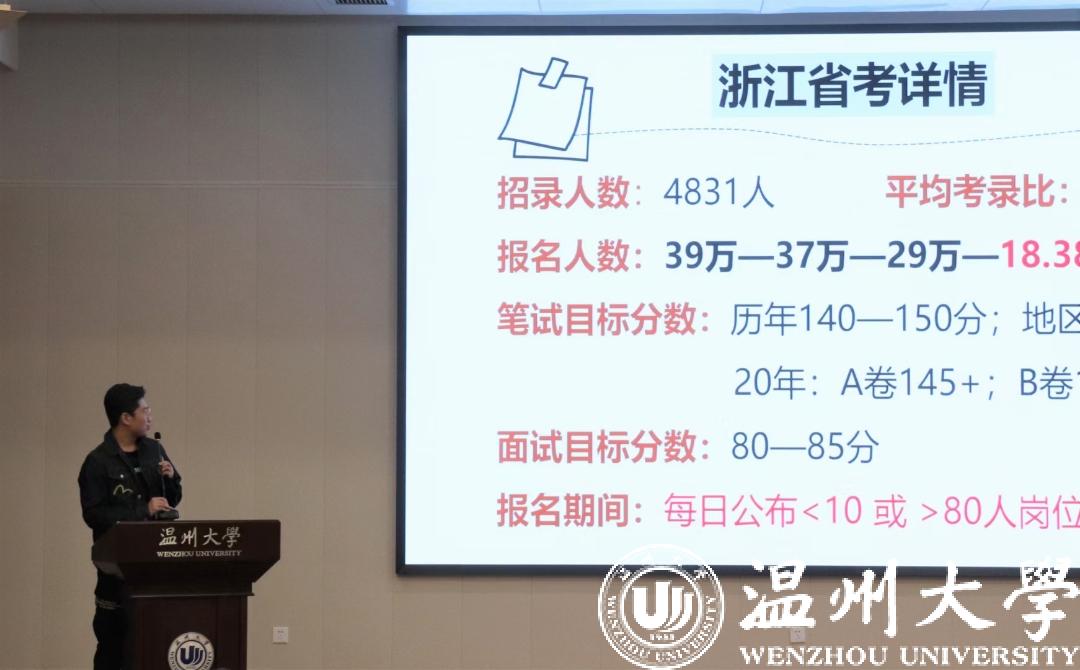 现就职于义乌市政府机关的鲍衍喆结合自身备考经历就浙江省省考概况、行测和申论的准备与答题、面试结构化等方面做全面分析和解答。考取国家税务总局湖州税务局的宋卓君梳理了国考整体流程,用数据将国考省考进行对比,分享了如何在短期内准备笔试和面试的心得体会。现就职于哈尔滨铁路公安局的尹世豪围绕如何选岗、如何将专业与兴趣相结合等角度分享考公心路历程。