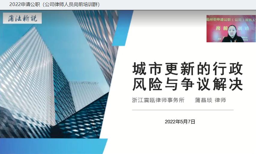 温州市律协行政委员会副主任、浙江震瓯律师事务所合伙人蒲晶琰主讲《城市更新的行政风险及争议解决》。