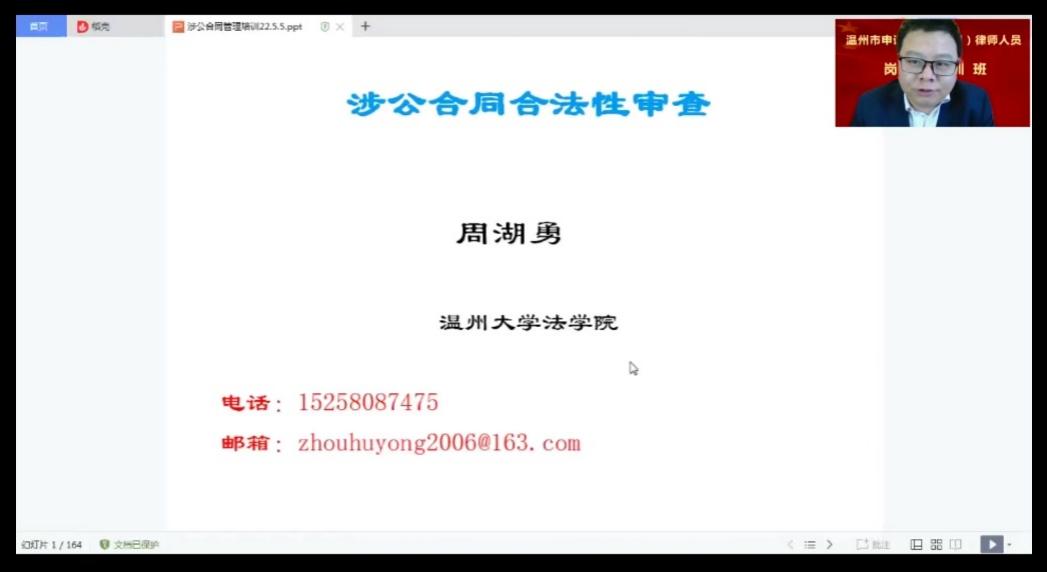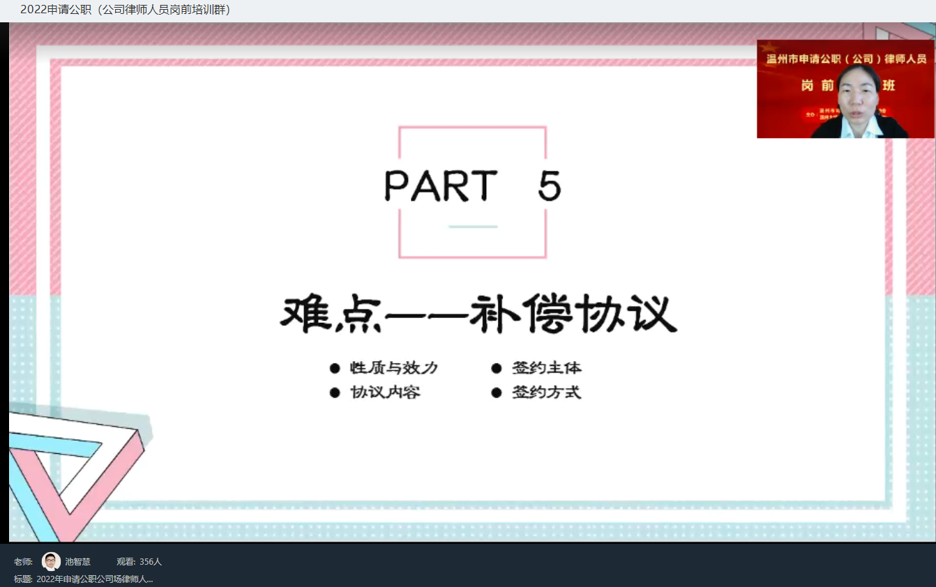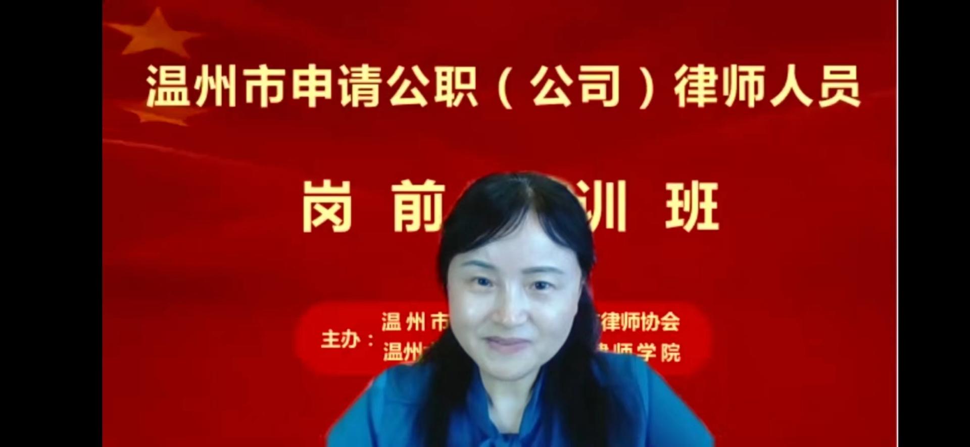 5月5日至5月7日,温州市司法局、温州市律师协会、看片狂人 和瓯越律师学院联合举办了2022年温州市申请公职(公司)律师人员岗前培训班。本次培训通过钉钉软件以在线直播方式开展,全市符合申请公职(公司)律师条件的人员共400余人参加。