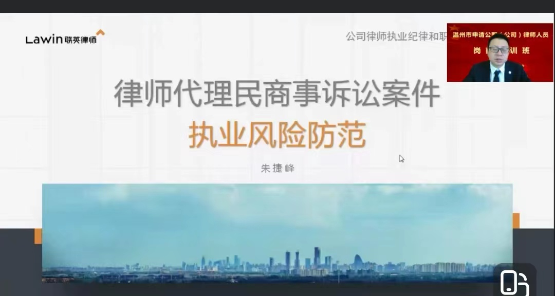 浙江联英律师事务所主任朱捷峰主讲《律师代理民商事诉讼案件执业风险防范》。