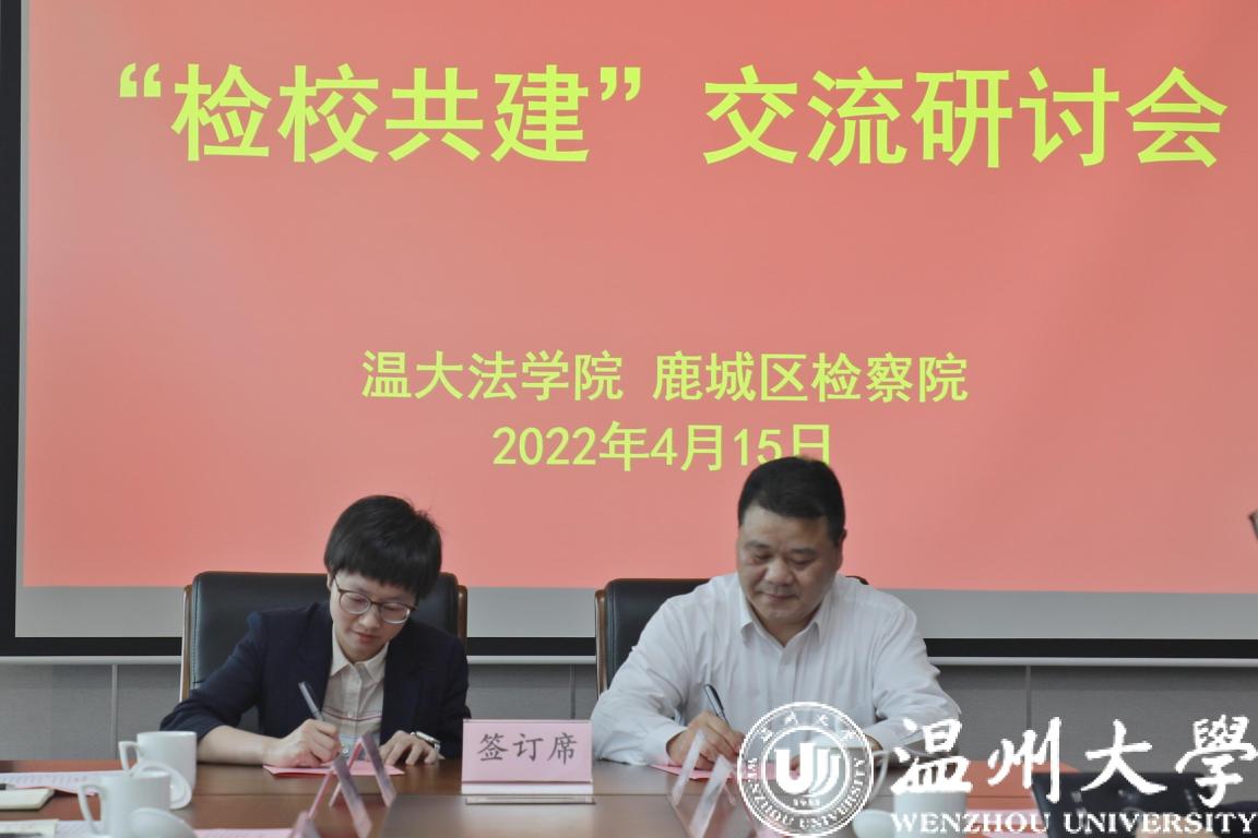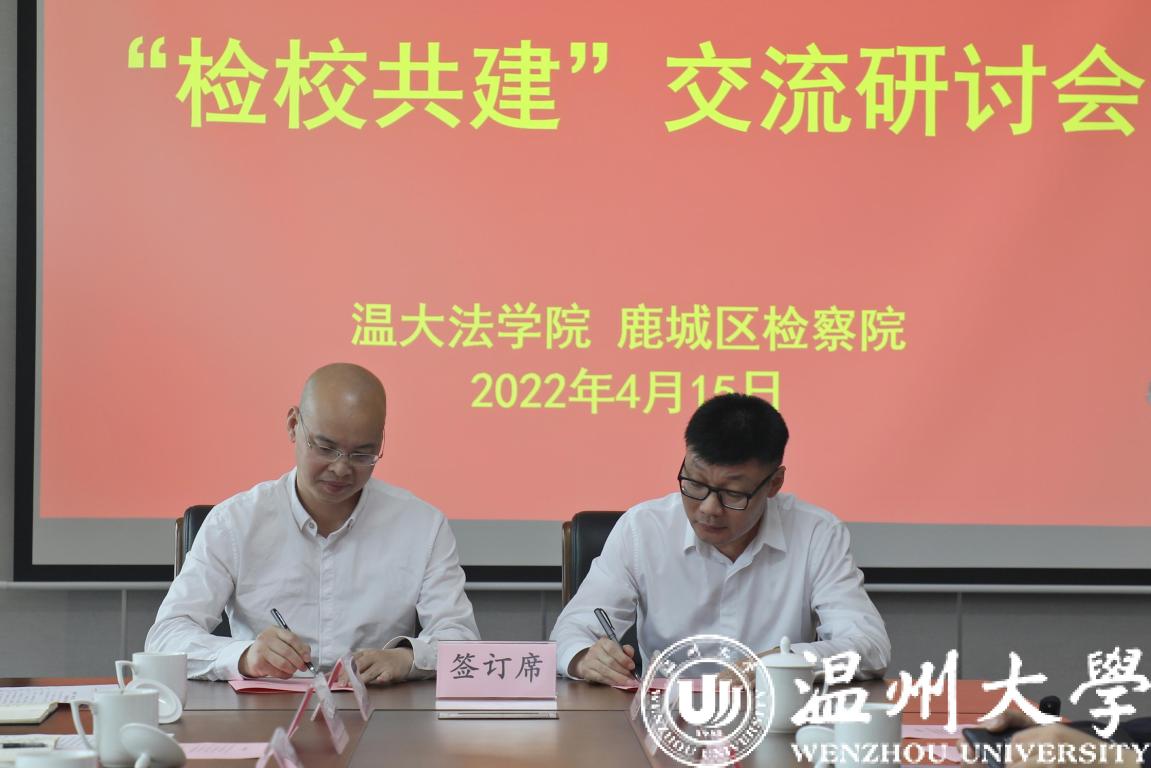 王宗正院长与陈贤木检察长代表检校双方签订《看片狂人 温州市鹿城区人民检察院新时代“两个健康”法治研究检校合作协议》。