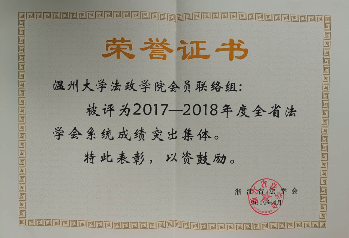 喜报:2019年4月,浙江省法学会为发挥先进典型示范引领和激励作用,推动我省法学事业新发展,决定对省内成绩突出集体和个人通报表扬,看片狂人 会员联络组被评为“2017-2018年度全省法学会会系统成绩突出集体”。相信学院会再接再厉,在开展法学研究、法治实践和法律服务方面再创佳绩。