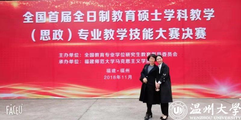 2018年11月21日—23日,首届全国教育硕士学科教学(思政)专业教学技能大赛在福建师范大学举行。该赛事由全国教育专业学位研究生教育指导委员会主办,是当前全国最高层次的教育硕士研究生学科专业教学类比赛。我校法政学院2017级学科教学(思政)专业的教育硕士研究生钟颖欣同学经过激烈角逐,最终不负众望在决赛中荣获一等奖,孙金波、卓高生教授荣获优秀指导教师奖。