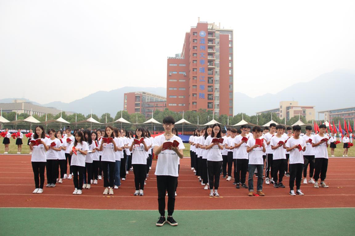 伴着响彻操场的《运动员进行曲》,国旗护卫队首先入场,紧接着是鲜花队、彩旗队,然后各个学院代表方阵依次入场。每个学院代表队都精心准备了入场节目,法政学院方阵学子身着简约清爽的院服,"牢记担当,百炼成钢,法政学子,再创辉煌"的口号响彻会场。当抒情的音乐响起,法政方阵手持法律读本带来的普法诗歌朗诵《法在心中》让人耳目一新,队员们深情地诵出了自己对法的信仰,也赢得了阵阵掌声。