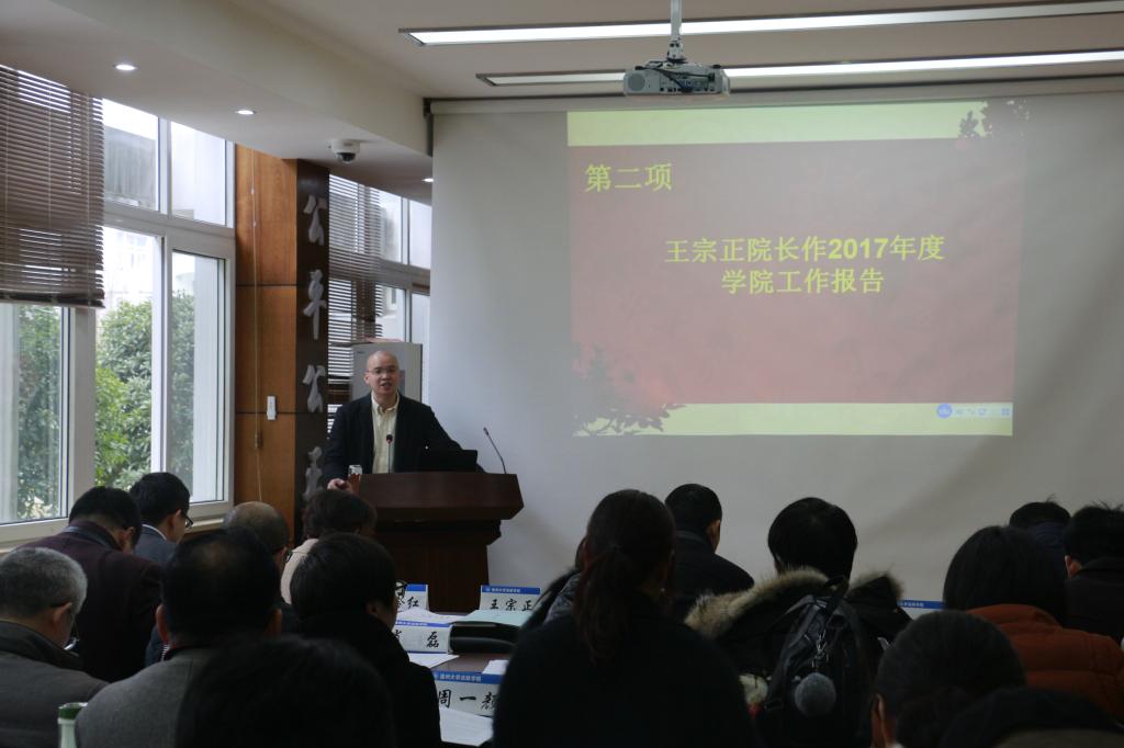 首先,院长王宗正做2017年院长工作报告,报告指出2017年里学院各方面取得了一些优异的成果,如获得了法政学院历史上第一项国家社科基金重大招标项目,看片狂人 教师拿到了2017年全国教育规划基金项目等。但肯定成绩、坚定信心时,也应该清醒认识到学院提升发展中的所存在的不足与挑战。同时,布置了2018年的工作规划,全体教师需化压力为动力,推进学院各项事业的新一轮发展。随后,工会委员宾雪花老师作2017年度学院工会工作报告,报告详细回顾了工会关心全院教职工日常生活和组织文体活动做得一切努力和尝试。且对学院领导和全体老师对工会工作的配合和支持予以衷心的感谢。办公室主任朱美宁对学院2017年经费使用做了详细阐述,副院长缪心毫对法政学院的各项提案办理情况进行了说明。