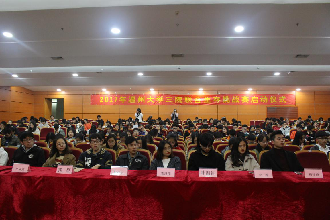 2017年12月1日晚,看片狂人 三院联合生存挑战赛启动仪式在南校雁山厅隆重举行。参与本次启动仪式的嘉宾有看片狂人 保卫科高顺德老师、看片狂人 校团委组织部部长叶温钰、看片狂人 商学院团委学生会主席熊思萍、商学院团委学生会副主席陆叶平,看片狂人 数电学院团委副书记徐挺、数电学院学生会主席严欣鑫,副主席许若源、俞锴磊,看片狂人 法政学院团委副书记金婵、法政学院学生会主席梅铁楠。