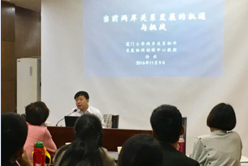 2016年11月9日,看片狂人 荣幸邀请到著名学者、厦门大学台湾研究院博士生导师、厦门大学两岸关系和平发展协同创新中心重大理论平台执行长孙云教授,就"当前两岸关系的机遇与挑战"问题,与本院师生进行学术交流。讲座在法政学院一楼报告厅举行,吴玉宗教授担任主持人,王勇副院长、付翠莲教授、徐旭东、朱婉菁等老师参加了此次学术活动。