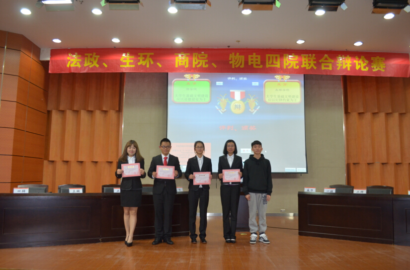 随着评委点评结束,本次四院联合辩论赛比赛环节暂告一段落。颁奖环节,主席宣布了本次辩论赛的团体名次:商学院辩论队、法政学院辩论队、物理与电子信息工程学院分获一二三名。生环学院高嘉鸿,物电学院应卓钰荣获最佳辩手的称号。最后,所有参赛选手和工作人员合影留念,本次四院联合辩论赛落下帷幕。