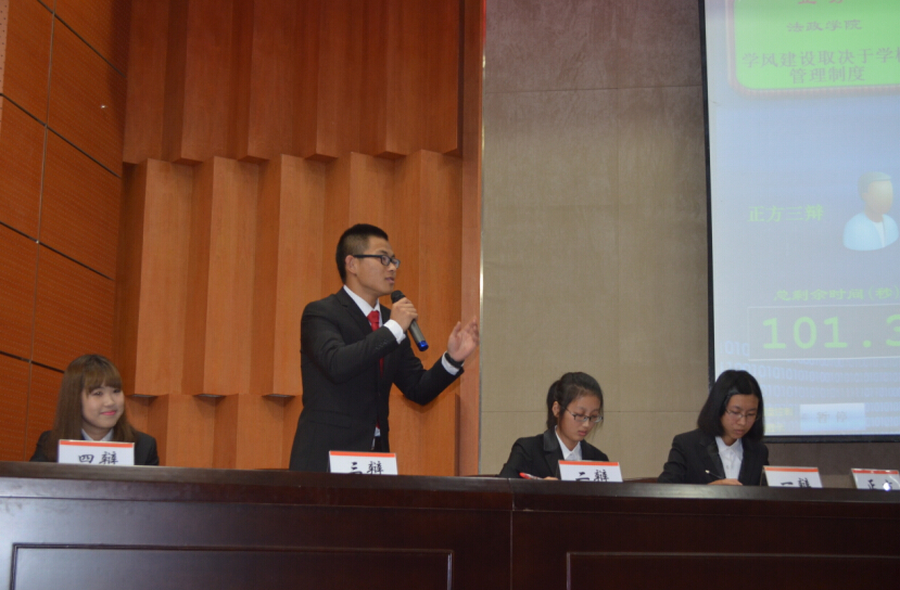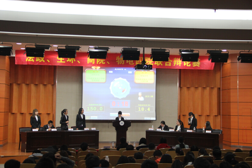 本场辩论赛由法政学院辩论队成员王佳艺担任主席,到场评委有生环学院团委副书记王燕,物电学院团委副书记江映月,法政学院辩论队队长余凌寒以及商学院辩论队队员吴俊克。本次比赛,法政学院辩论队派出王晶晶、董佳柔、章方正、贲宁四位辩手参赛。第一场比赛,法政学院对辩物电学院,他们围绕"学风建设取决于学校管理制度还是学生自我约束"展开精彩辩论。正方法政辩论队从学校、教师、学生三个层面提出建设学风要全方位多层次,所以要通过管理制度进行全方位约束、管理;反方物电学院代表队则紧紧抓住"取决于"这一关键词充分论述学生的主观能动性。精彩的比赛引发现场不时传来一阵又一阵的掌声为辩手们喝彩。赛后,吴俊克评委从辩风、辩题、内容等角度对本次比赛进行了点评。第二场比赛由商学院对阵生环学院,他们的辩题是:"大学生基础文明建设应以道德建设/纪律约束为主"反方生环学院虽然派出的是临时替补选手,然而他们还是克服困难,打完了全场比赛,获得了观众们鼓励的掌声。比赛结束,评委余凌寒对第二场比赛的论点、内容等方面做了鞭辟入里的点评,双方辩手通过旁观者的视角,再次审视己方的论点,获益良多。